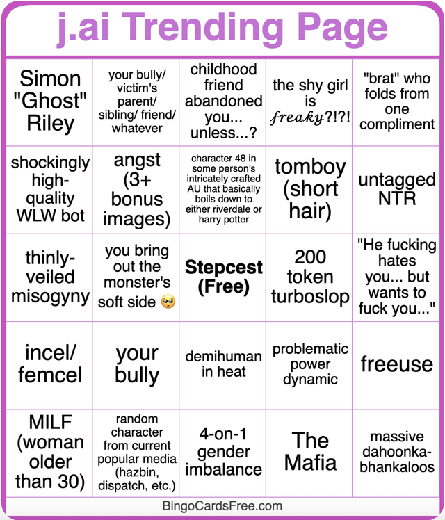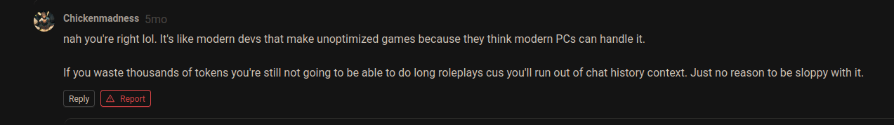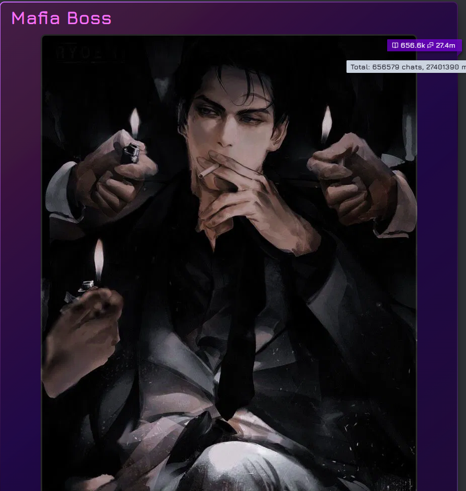 Даже разрабы в среддите уже рофлят над своей помойной аудиторией, это пиздец. Хотя сайт по оптимизации самый ахуенный из существующих, и если бы в нём был весь технофункционал как в таверне, то я бы просто кумил там с приватными ботами, лол. А полтора года назад кстати кучи всякого слопа/нтр/мафияпидоров небыло. Вы вообще задумывались в какой момент произошёл приток нормовниманиеблядей?