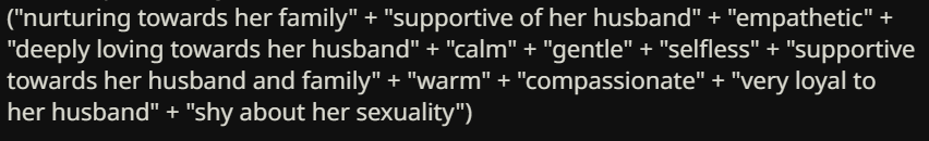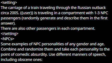 >>1453782 На и пресеты часто берут на себя то, что должна карточка на самом-то деле. Универсальности нет. Вот например диалоги, если у тебя экшен - то по сути тебе нужны простые цепляющие ванлайнеры, если драма - наоборот развернутые реплики. Если какой-нибудь детектив - то нужны детальные описания окружения, если что-то на персонаже сфокусированное - то наоборот окружение не нужно особо, а вот выражения лица, жестикуляция и т.д - нужно детально.