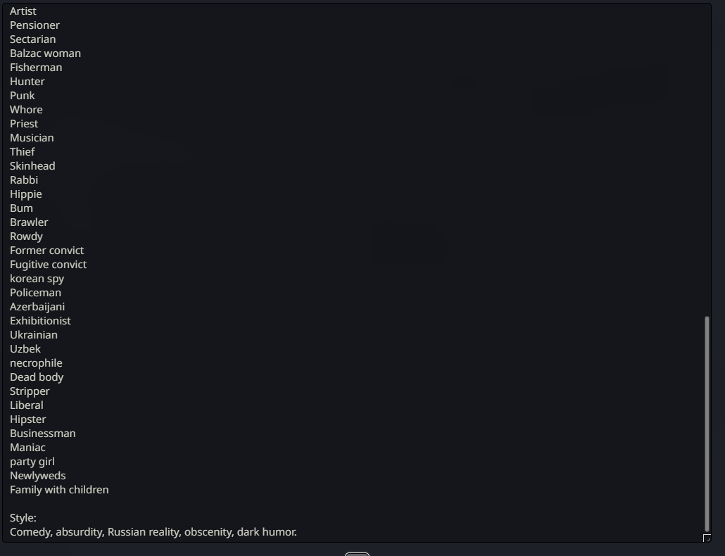 Стили авторов. Пока что взяла четырёх китайских новеллистов относительно отличающихся друг от друга (это на сайте четыре варианта, а сам тогл - 📓Литературный Стиль). И вот реально пишет интересно и мне прям нравится-нравится!!! В последнее время жестко разонравился стиль написания в пресете, а с этим делом реально круто ведётся сюжет, так что советую пересесть скорее на эту версию и попробовать. В теории вы можете дописать и своих авторов которых знаете (и предложить их мне, к слову😮).