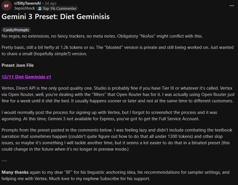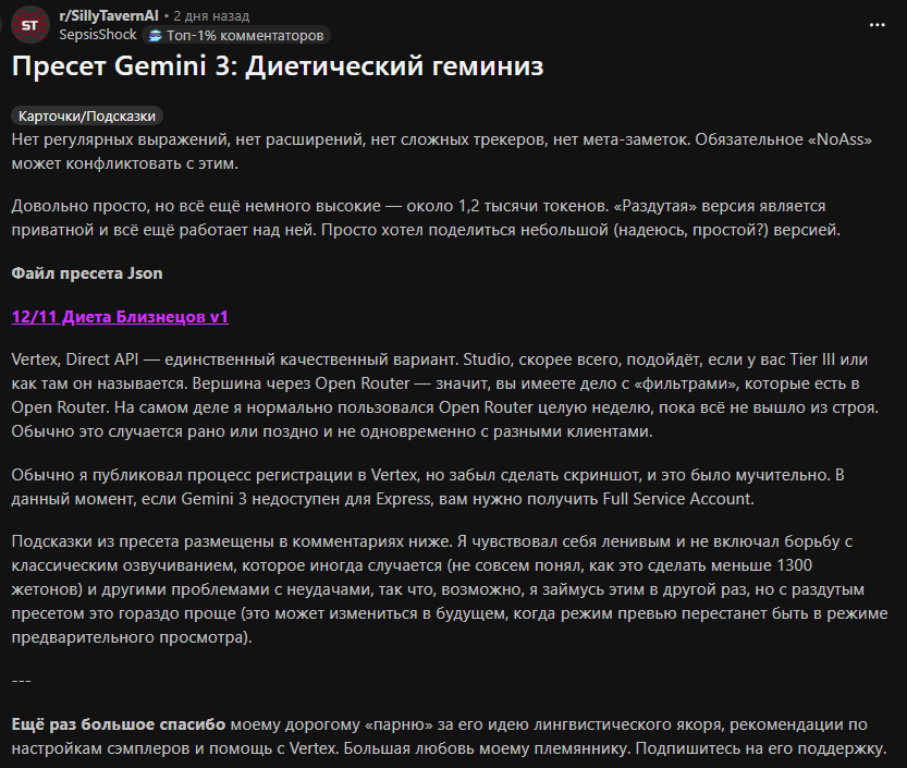 Блять, неужели нет норм пресета на гемини 3 от базовых людей в треде? Пробовал пресет ремиксера, но LLM будто похуй на эти промпты. Хуячит текст полотном, без форматирования (хотя они же явно сука указаны в пресете), без доп. ползунков (тупо похуй). Как итог, один свайп полотно бед диалога, другой свайп онли диалог, третий плевок на 200 слов, а четвертый полотно на 700 слов. Это блять и есть ваш гемини 3? Или пресет настолько хуевый? Чет с глм и писиком было в разы проще, из коробки работали адекватно.