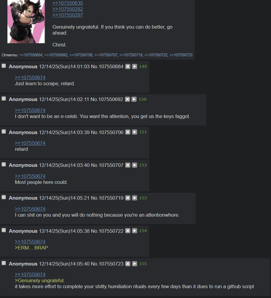 >стабильно растут статы на гсп-гемини-про у помидора, чуть ли не по миллиону токенов в минуту >эндпоинт гсп есть в списке >"такого эндпоинта не существует" Мне мерещится чтоли что цифры растут? Гсп "не существует", обычная прошка кормит ошибками. Клод испарился как-будто его никогда и не было, а жомини которая всегда была доступна, как оазис кума посреди бесконечных песков дума, пересохла впервые за десятилетия. Как-то грустно получается под новый год