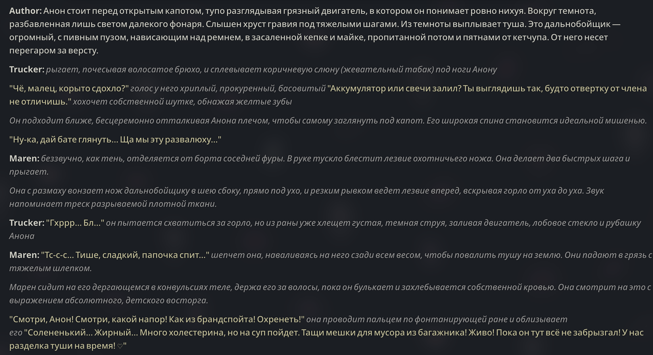 >>1455651 Я вёл на своих ключах гемини ролевой сюжет про моральное падение и восстановление солевого-наркомана Питерского певца, обретение семьи, потере семьи, и куча других неприяток.