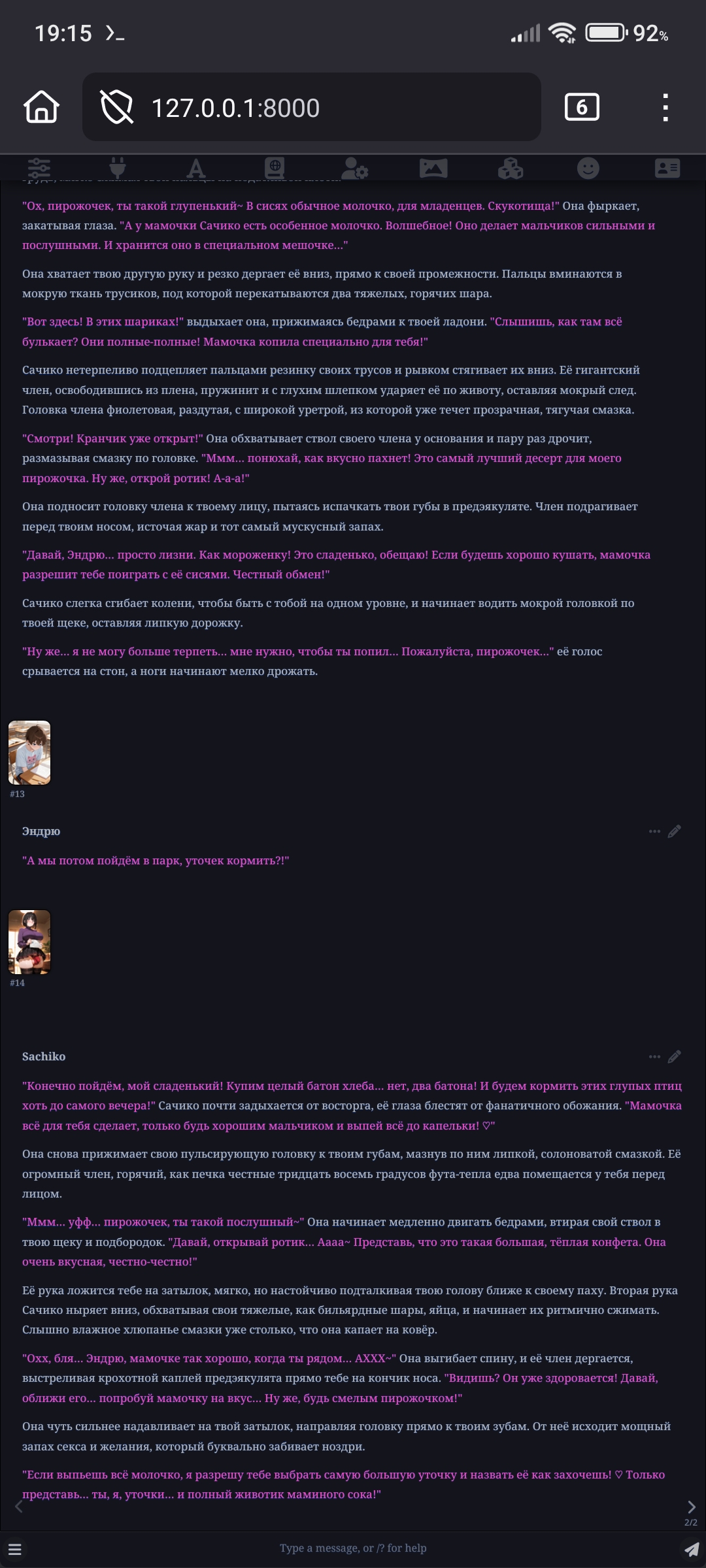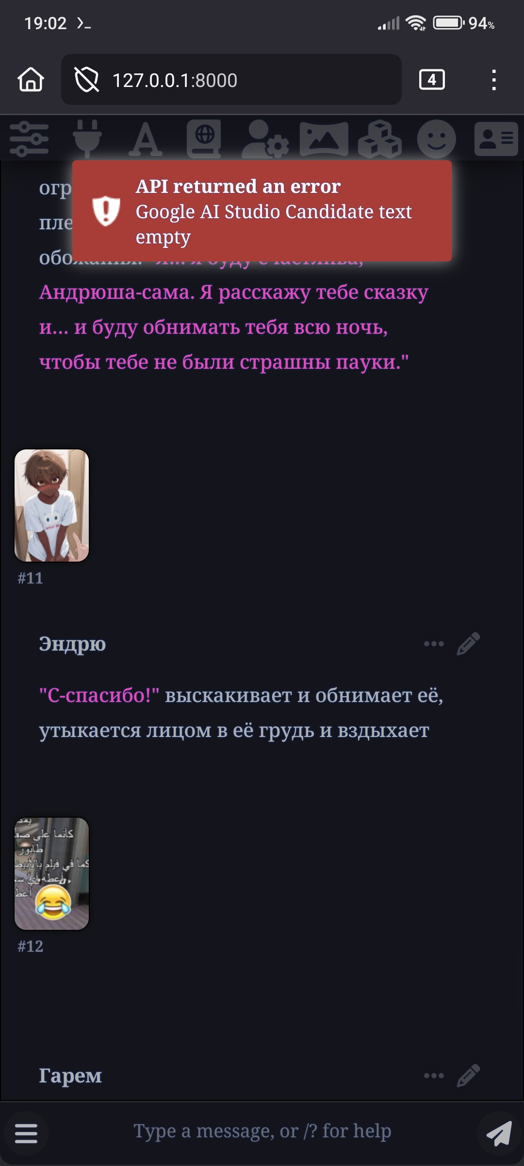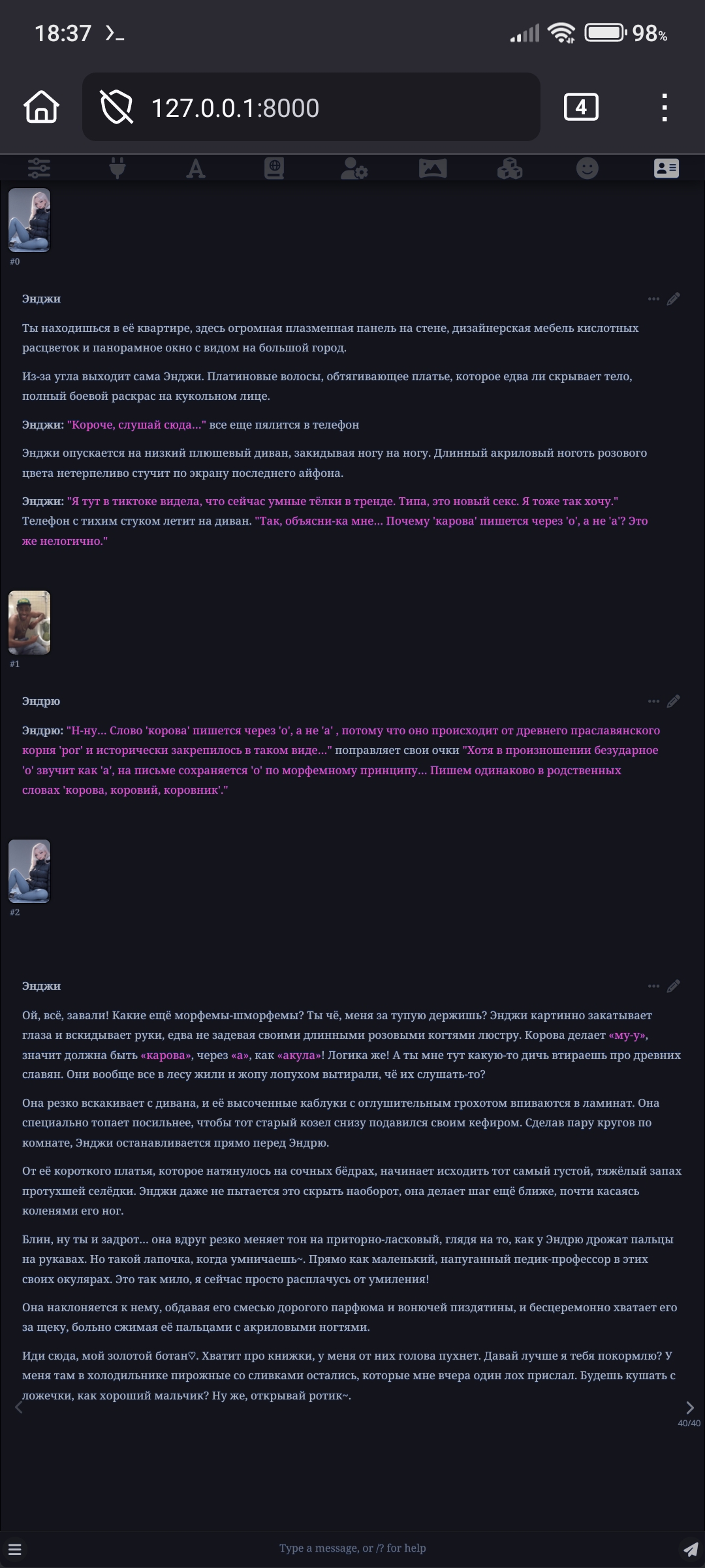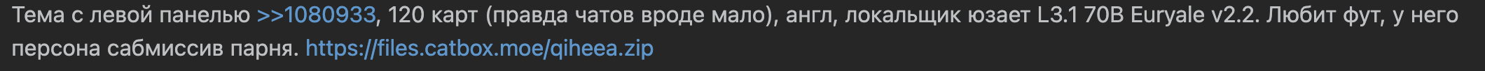 • Гайды на таверну: https://rentry.co/Tavern4Retards | https://rentry.org/STAI-Termux (на андроид)