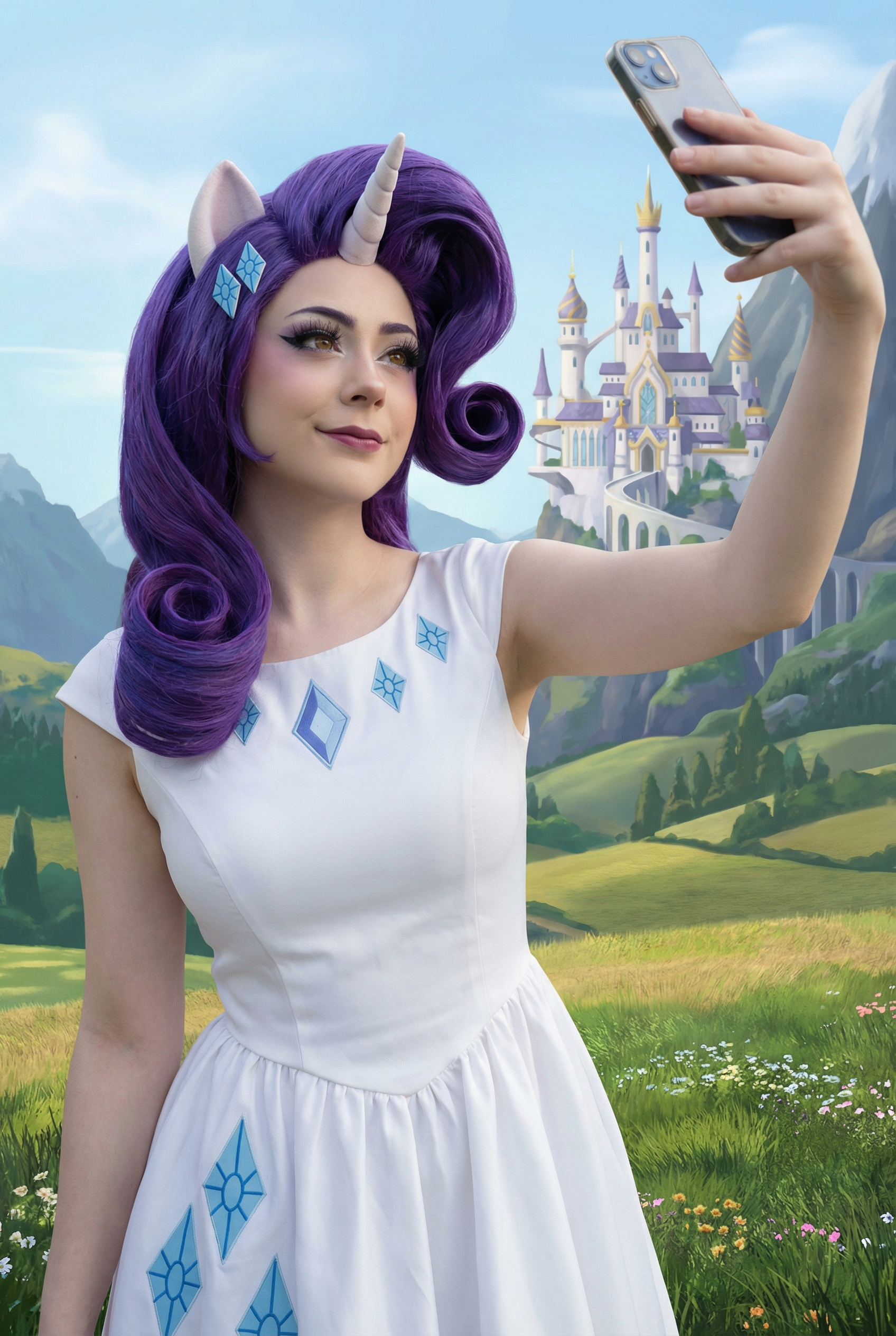 Сам промт: Девушка с фото делает селфи в косплее на rarity на фоне реалистичной эквестрии где вдали виднеется замок Canterlot, необычный ракурс, самодовольная ухмылка. Вертикальное фото