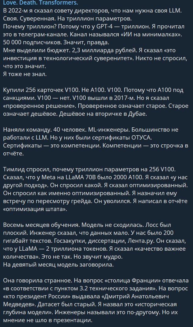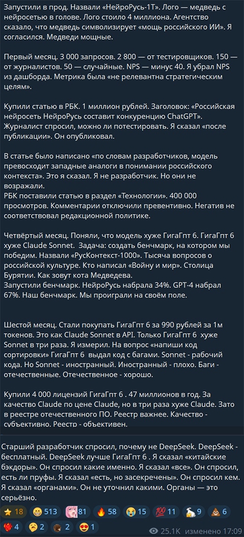 Прочитал местные треды (от нехуй делать на работе). И хочу вставить свой никому нахуй не нужный прогноз на тему шизы по ИИ. 1. В ближайшие пару лет пузырь ИИ лопнет. Куча мелких контор обанкротится. Самые жирные кабаны зафиксируют прибыль. 2. Попильщики на государственном уровне съебут кто куда. Кого-то посадят. Кого-то пристрелят. 3. Школьники вернутся в библиотеки и будут также писать от руки сочинения, пользуясь всякими "Краткими изложениями" и "Готовыми домашники заданиями". 4. Студенты вернутся к написанию шпаргалок и зубрению формул сопромата. 5. Петровичи вернутся к станкам. 6. Из браузеров пропадут "умные поисковики" и прочие "Алисы". 7. Сайты снова будут делать фрилансеры на флеш и на фреймах. Программисты снова будут говнокодить и нанимать индусов на аутсорс 8. Офисный планктон вернётся к горам документов, который будет печатать ручками.