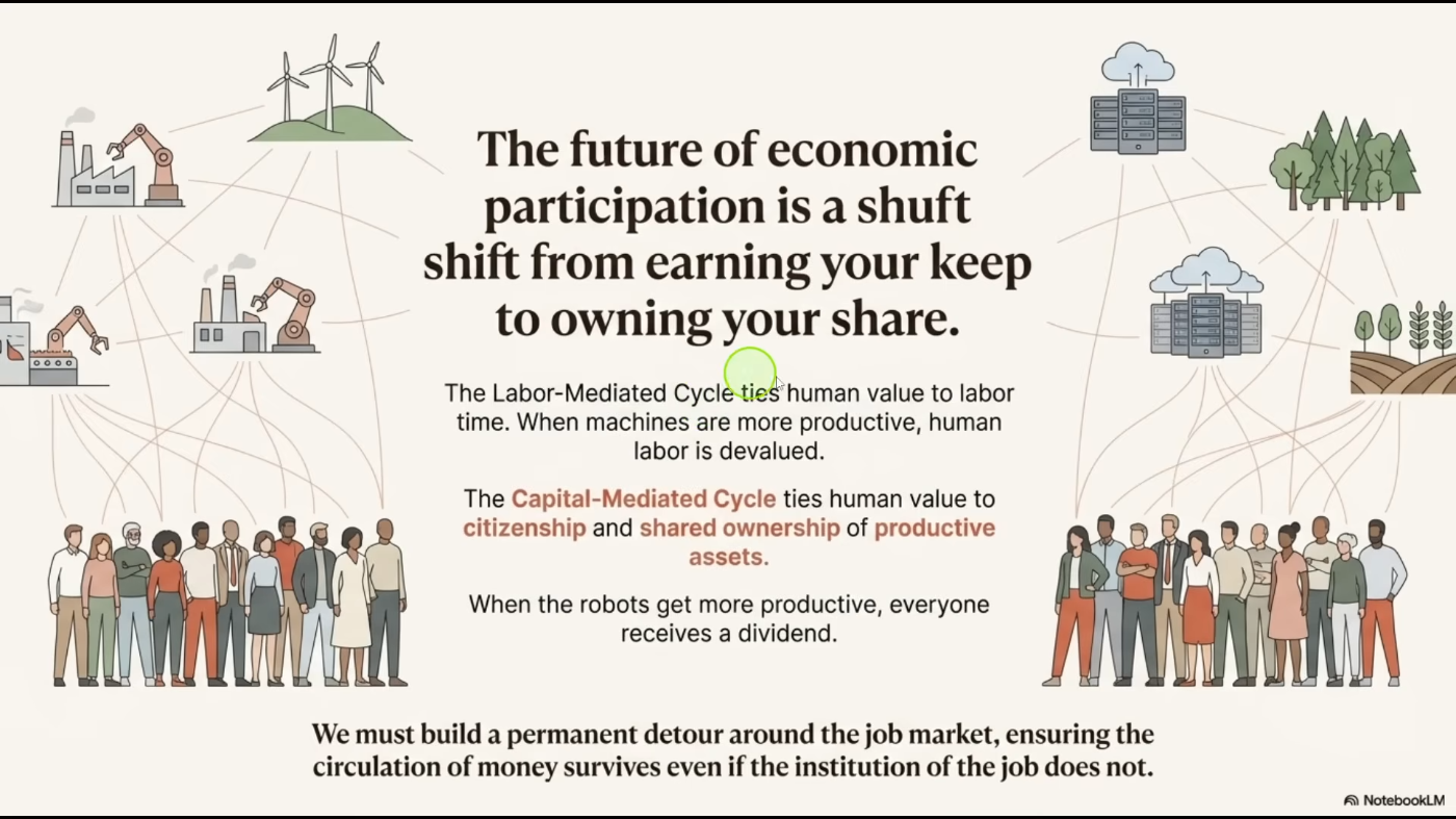 Он видит грядущий фундаментальный сдвиг. Сейчас мы в основном воспринимаем ИИ как нечто вроде удобного и полезного инструмента, верно? Он может спланировать ваш отпуск или помочь с электронной почтой.