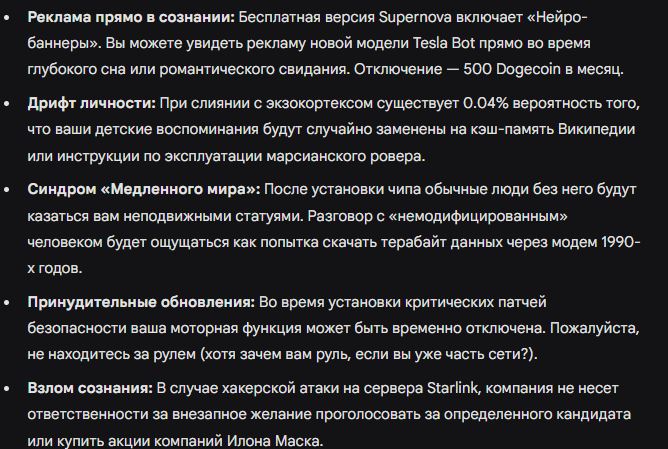 >>1466604 >Жизнь не готовит обычного гречневого васю к жизни бок о бок с обществом Маск подсуетится и начнёт массово вживлять в мозг чипы-ИИ-ускорители воспользовавшись моментом, и реклама у него будет что-то вроде: "Скорость передачи данных в твоём нейроне - жалкие 100 метров в секунду. Не будь умственно-отсталым, не оставайся неполноценным, наш продукт сделает тебя умным".