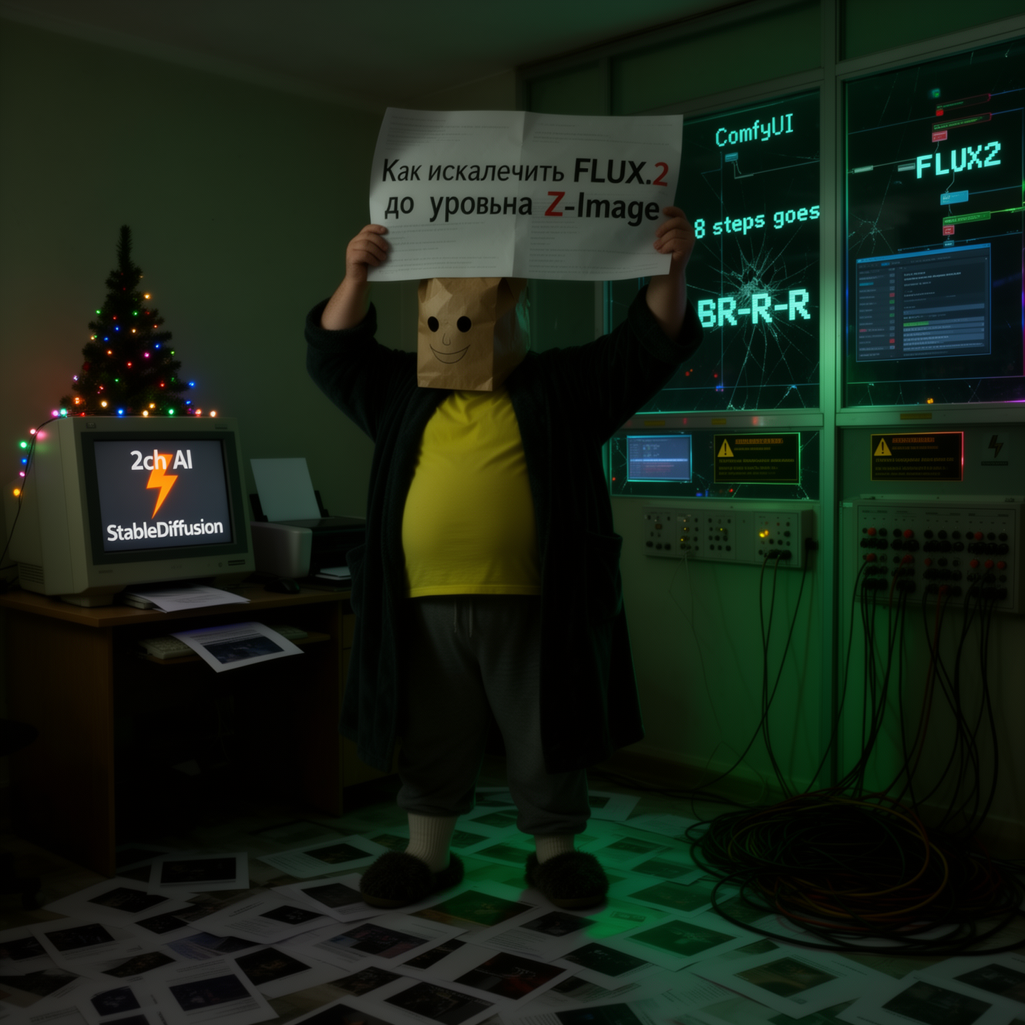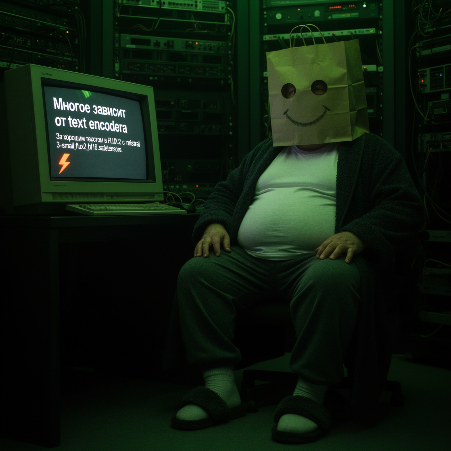 >>1462562 У меня как раз 4080s. FLUX.2 жирный и тормозной (чтобы ворочался побыстрее, MultiGPU узлы в помощь и достаточный объём RAM для оффлоада, чтобы SSD не дрочить; у меня 128 Гбайт). Для получения качественных результатов в сложных сценах promptах без JSON-разметки (и специальных узлов, которые позволяют её собирать) лучше не лезть. Мне нравится, что она качественно позволяет текст выводить и следует promptу (даже сложному, детальному, при наличии JSON-разметки). А вот всё остальное (в том числе сложность получения «гиперреализма», который в не особо близком мне Z-Image есть прямо из коробки, а на FLUX.2 для этого нужны realistic LoRAs типа lenovo_flux2.safetensors; да и то с оговорками и переменным успехом). Ещё, если это читают coomerы, то в NSFW FLUX.2 «из коробки» не умеет совсем; сверхсоевая модель.