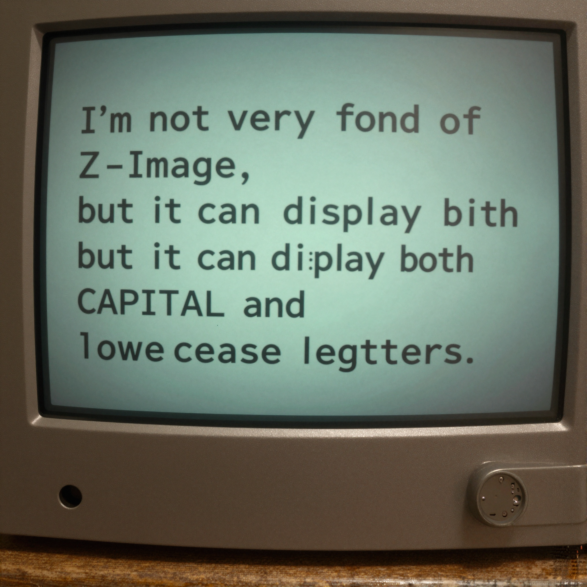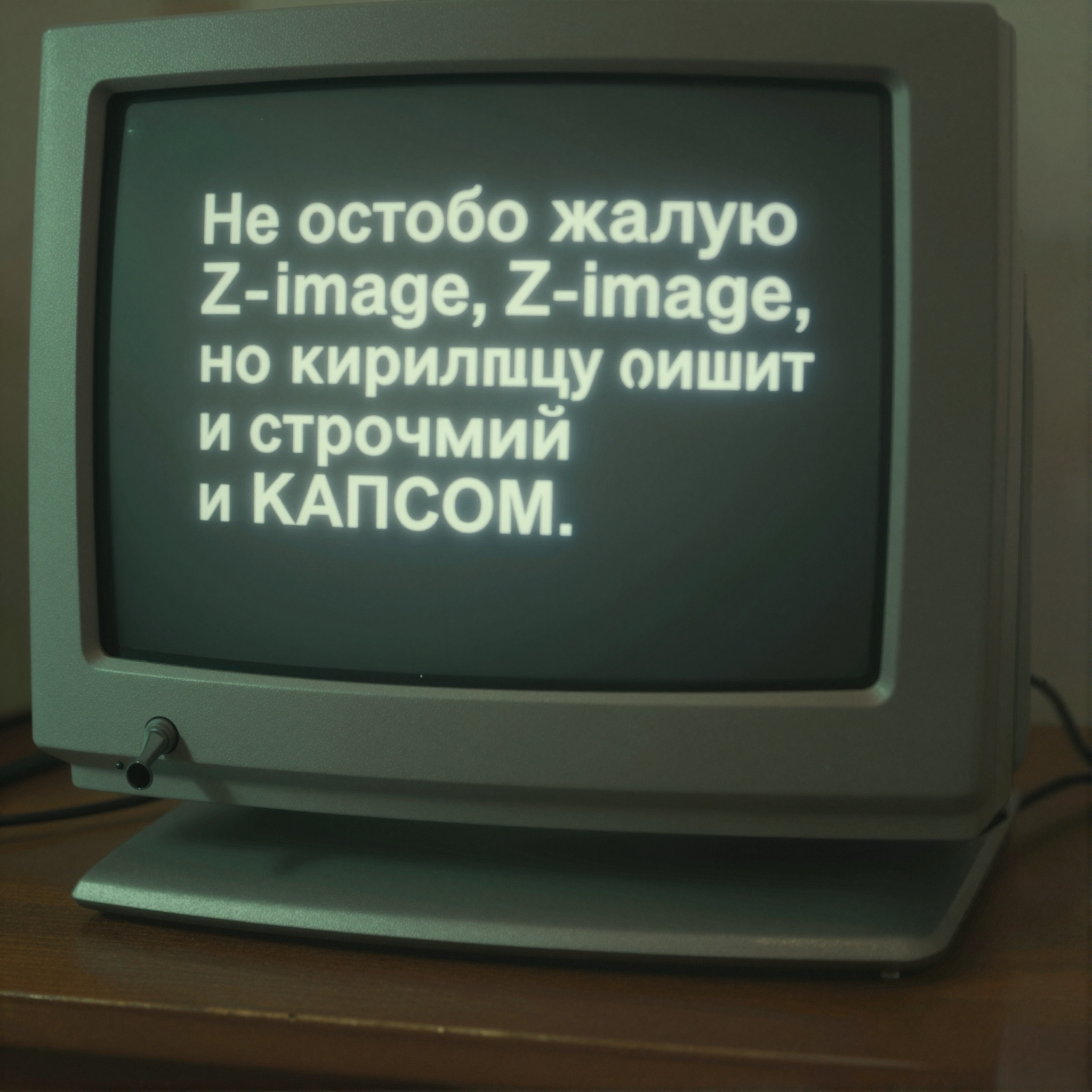 Prompt: A medium close-up shot of a crt moninor, displaying text 'Не особо жалую Z-Image, но кириллицу пишет и строчными и КАПСОМ.' Green ambient cinematic key-lighting.