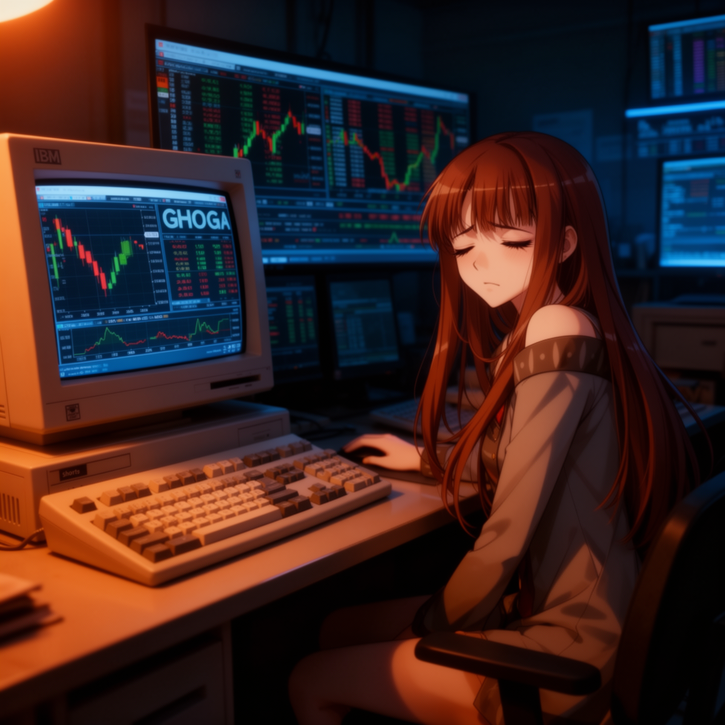 A hyper-realistic 1990s digicam style with CCD sensor characteristics photograph, a medium-shot depicting a character from Image 1 in 2d anime style, pretty tired and sleepy, sitting at the vintage 90's era IBM PC terminal with CRT monitor, displaying 3 copies of reference Image 2, vintage mechanical keyboard, at 1990s stock market with CRT television screens and trading stocks shorting. Warm lighting, dramatic lighting, orange tint for highlights, blue tint for shadows.