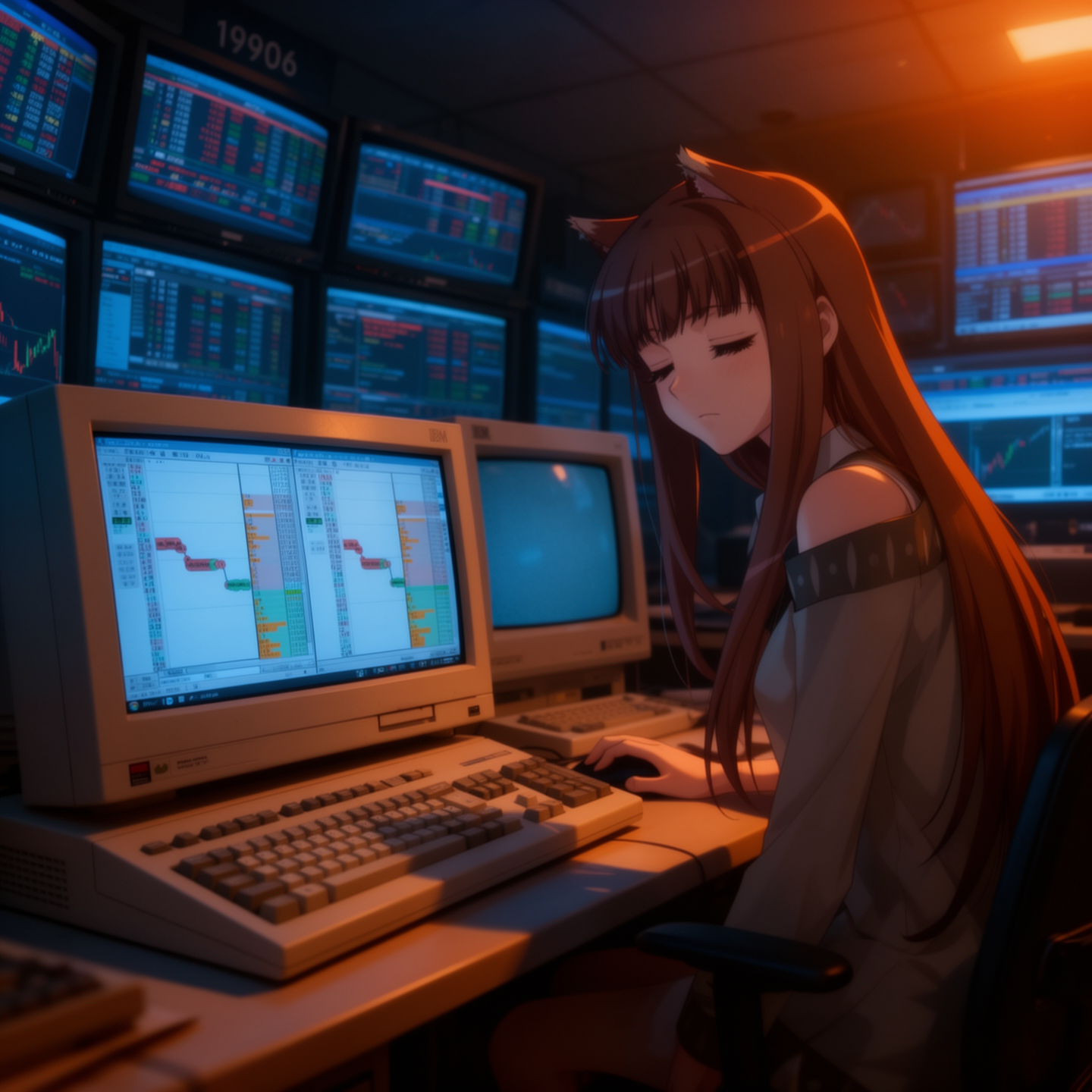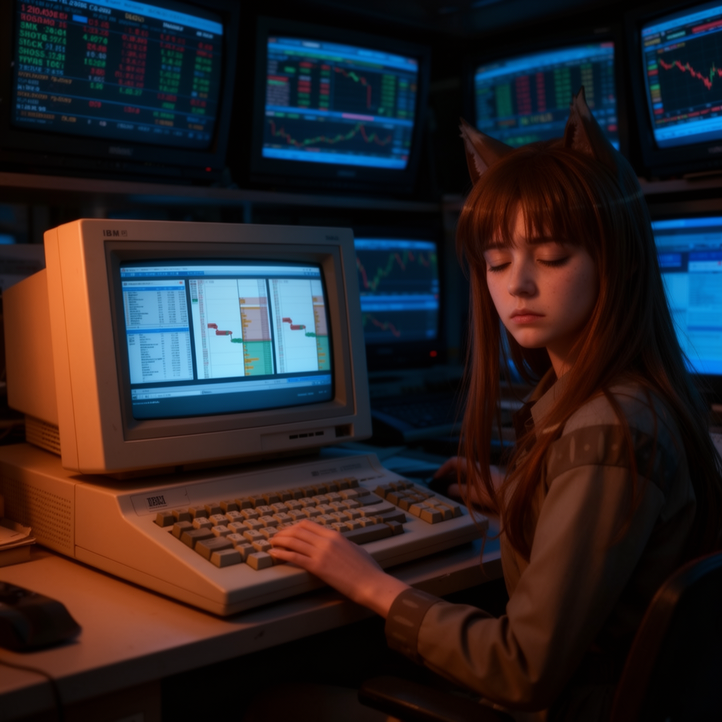 >>1462570 Тогда усложним задачу. Тоже самое, но в 1990х, монитор один и ламповый с тремя стаканами акций на экране, механическая клавиатура для трейдинга. И Холо порядочно уставшая.