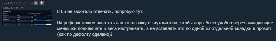 На рефорж можно накотить как-то плюшку из аутоматика, чтобы лоры было удобно через выпадающие менюшки подключать и веса настраивать, а не вставлять это по одной из отдельной вкладки в промпт (как по дефолту сделано)?
