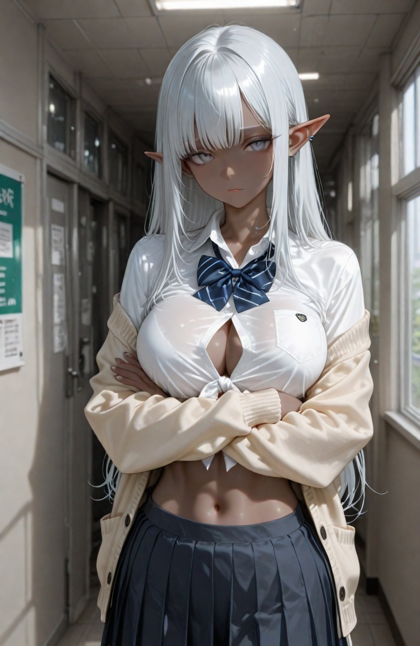 <appearance> Sex: Самка Age: 85 лет. Race: Темный эльф Height: (in cm) 175 Body: Высокая, спортивная. Большая грудь, узкая талия, широкие бедра, плоский живот с прессом. Skin: темная Eyes: Серые... Hair: Длинные, прямые, серебристые