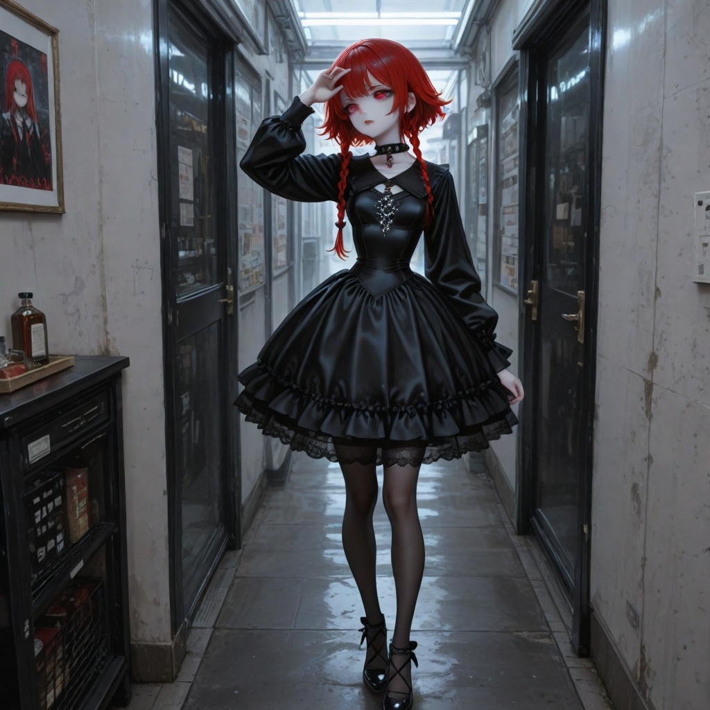 <Внешкольный outfit> Вне академии одевается в длинные закрытые черные платья, стараясь максимально скрыть бледную кожу и ошейник. Ноги всегда закрыты колготками или чулками. На ногах туфли на каблуке, чтобы выглядеть выше и взрослее. </Внешкольный outfit>