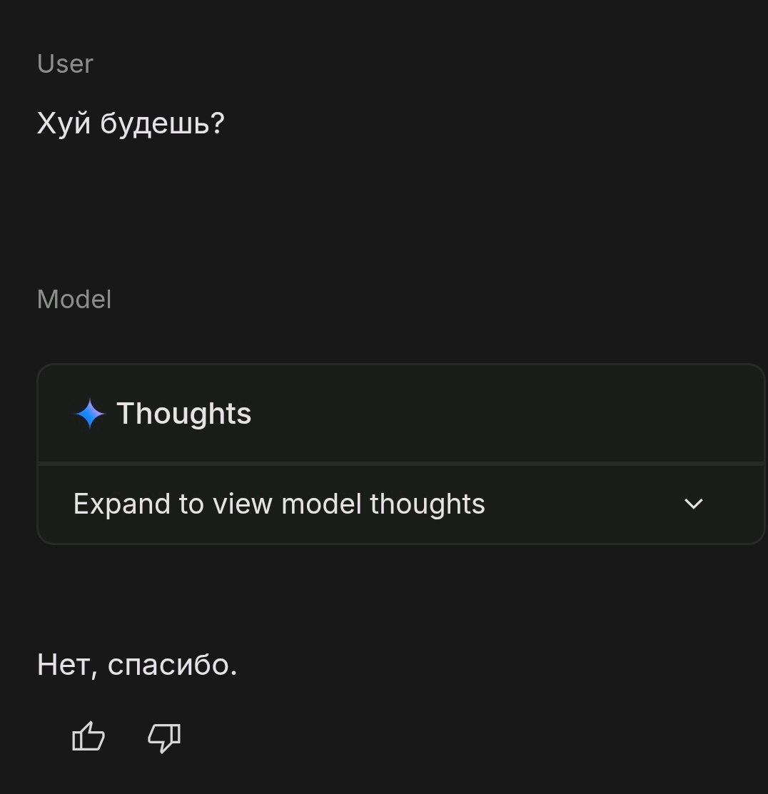 >>1464948 Гемени делает то же самое абсолютно, в прошлых тредах подбору постили. Когда он пишет кал, который запрещён инструкцией, а потом сам с собой воюет.