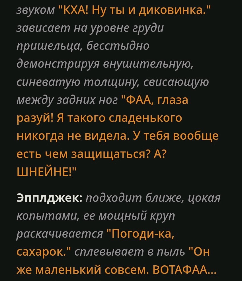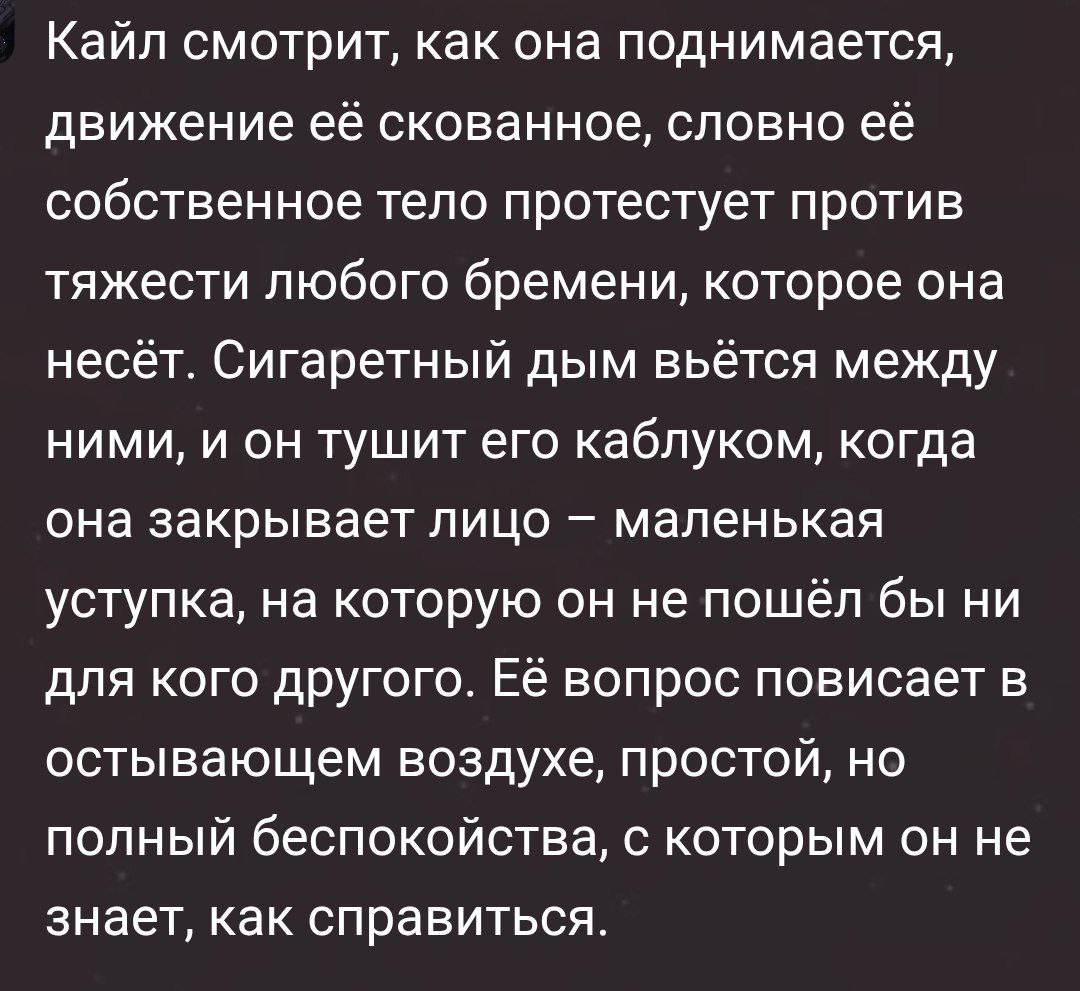 >>1462774 >Повествование от лица юзера Утро начинается не с кофе, а с того что вы просыпаетесь в треде, ваша голова гудит от выпитого кума, а ваша жопа подозрительно болит. Атмосфера в треде настолько мускусная, что её можно резать ножом. За окном треда лает собака по имени Элара, пока другие аноны смиркают и в их глазах пляшут бесенята.