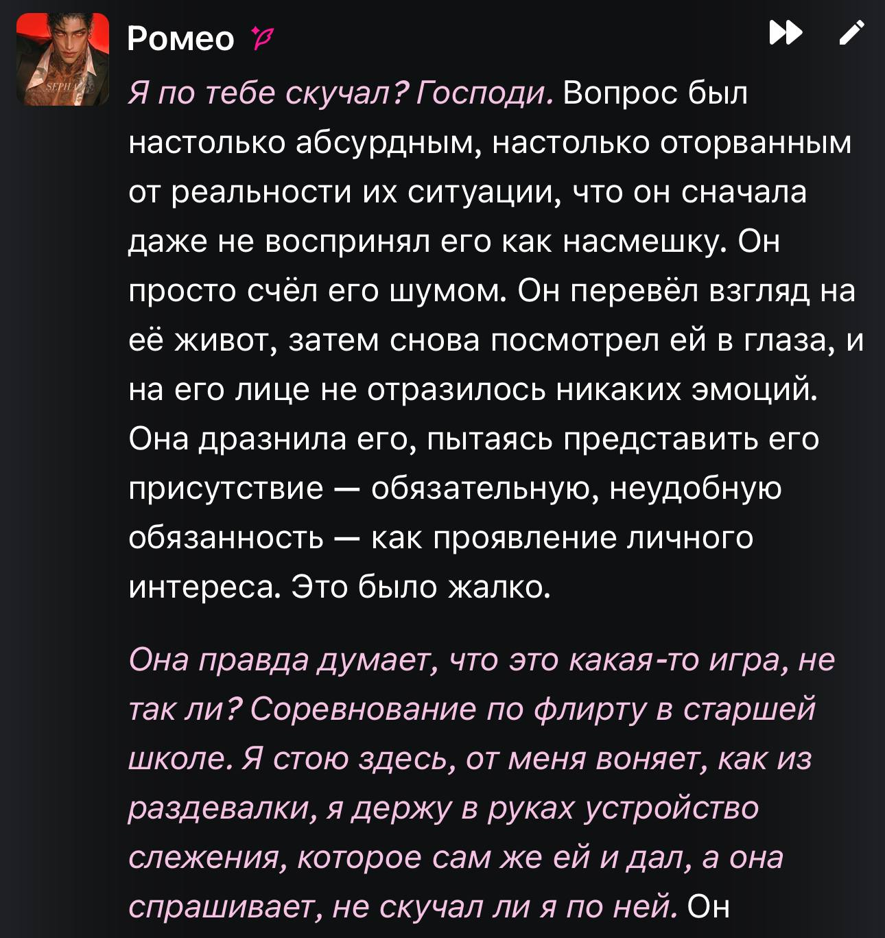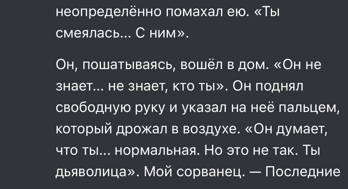 >>1462778 >Это буквально дефолтный формат у всех, со времён ГПТ-2. У кого у всех, у куколдов? Я до переката на безжоп исключительно на аутпуте во 2 лице рпшил. В 3 лице даже проза самая слопная.