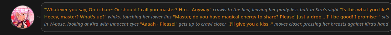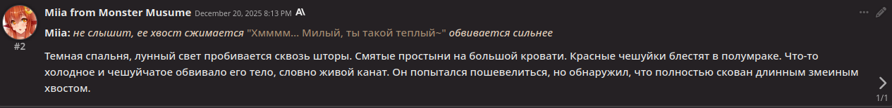 >>1465253 Пиздец как плюсую + умножаю + двачую. я хз как это чниить. Я порой просто ей в ooc пишу Write less please, на время помогает, потом опять приходится напоминать. А то заебывает когда я пишу 1 строку, а геминя сообщение на 500 токенов.