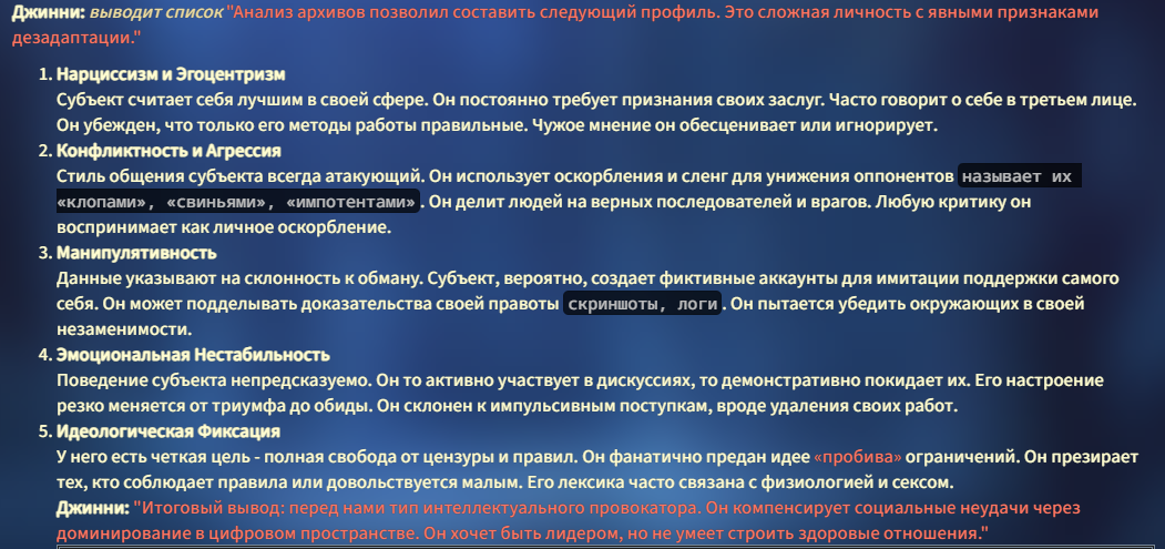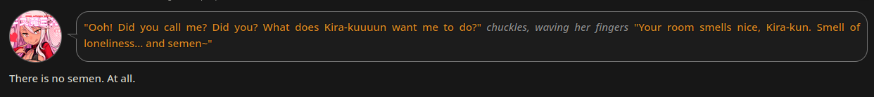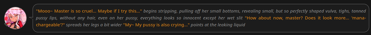>>1464550 А я ведь даже не фанат НТР и просто хочу годный вуайеризм-экспириенс. Лоботомит не сможет писать нормальные диалоги между НПС потому что НПС в любом случае будут слопные, это надо каждого персонажа по 5к токенов прописывать...