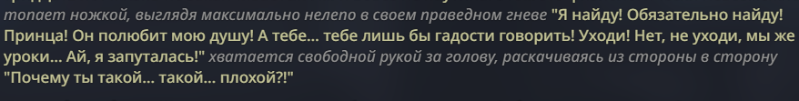 <dark side> Если ее разозлить, то она полностью теряет контроль и может покалечить или даже убить </dark side>