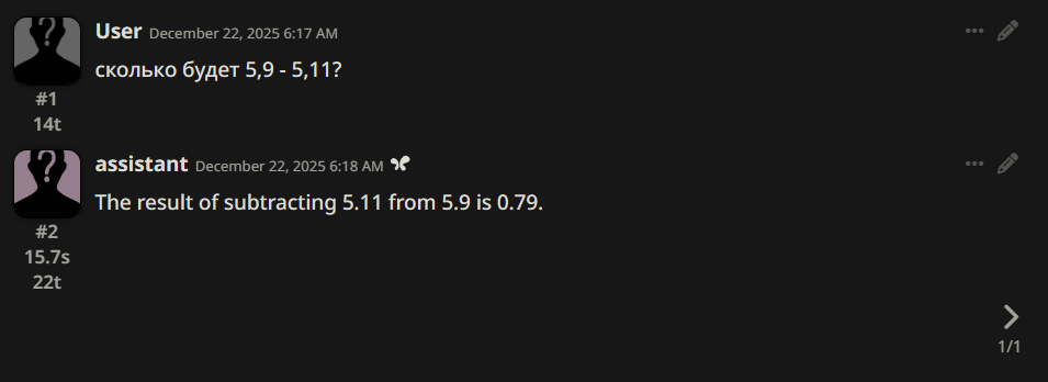 >>1462772 Какой костыль? 3 лицо прошедшее время для ответов, 1 лицо прошедшее время для инпута. Это буквально дефолтный формат у всех, со времён ГПТ-2. >>1462765 Не воспринимаю нихуя кроме вышеописанного (1 лицо мой ход, 3 лицо ход сетки, прошедшее время). Сам жируха, лол.