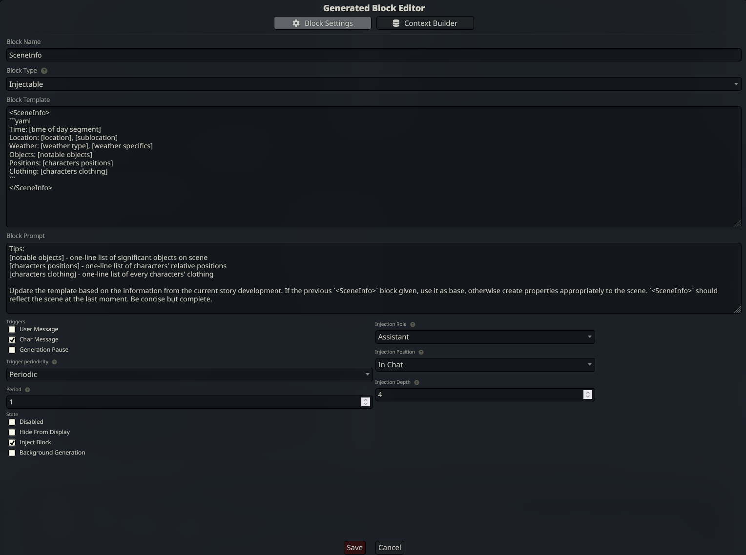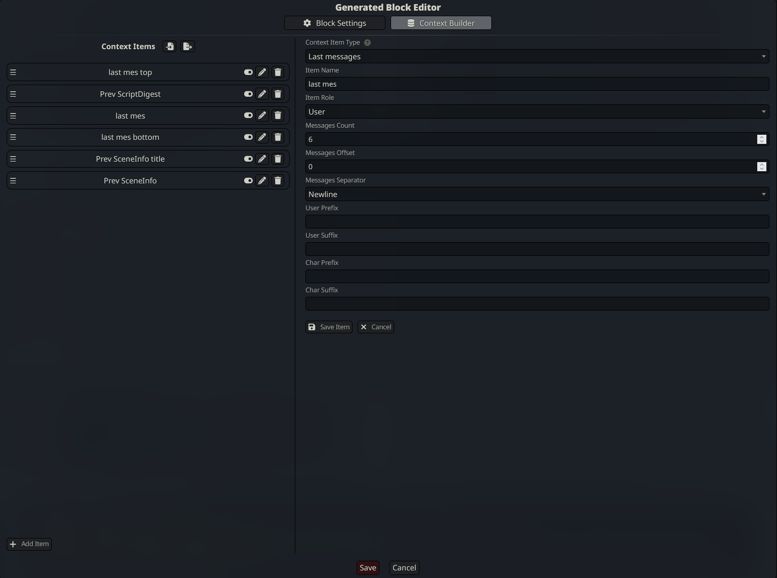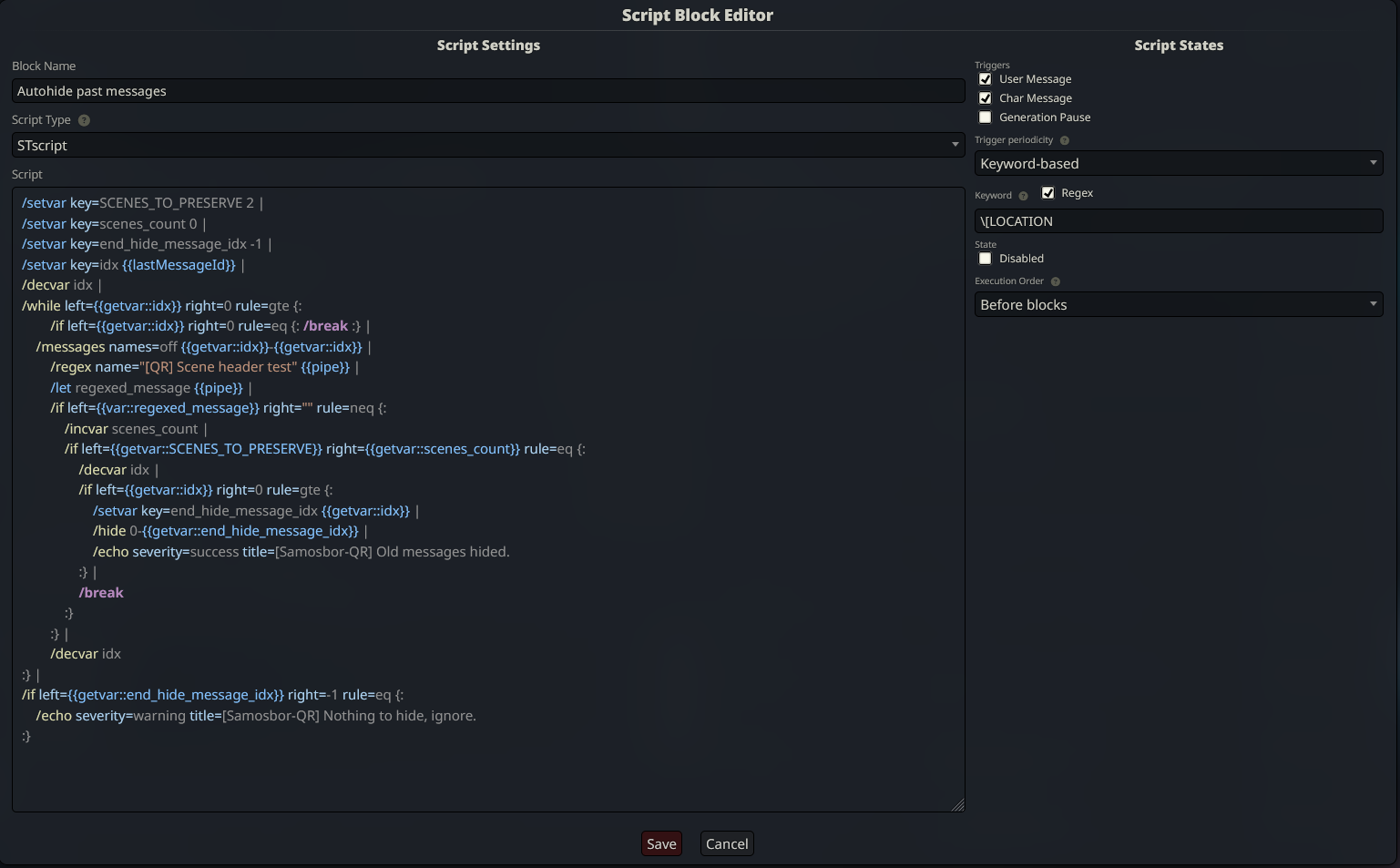 Довольно приличную часть кода переписал, кое-чего изменилось функционально: - Сделал редактор генерируемых блоков табовым. Теперь для контекстных элементов выделено не четверть окошка, а побольше. Также у контекстных элементов появились тогглеры. - Для скриптовых блоков появилась подсветка синтаксиса и автокомплит (для JS пока он примитивный, но есть). - У скриптовых JS блоков чуть поменялся API функций расширения (в основном добавились префиксы). Если их кто использует, лучше сверится. - Для рерайт блоков появилась фича частичного рерайта, примерно как в том рерайт расширении, название которого я забыл. В меню редактирования сообщения добавлена кнопка карандаша в квадрате, по нажатию на который активируется режим выделения. По выделению текста выскакивает окно как на пикрил 4, где можно выбрать рерайт блок и задать дополнительный промпт. Выбранный текст доступен внутри рерайт блока как {{textToRewrite}}, дополнительный промпт стандартно как {{additionalPrompt}}. После нажатия на рерайт блок отправляется на генерацию и переписывает только выделенный текст. - Аккумуляционные блоки в общем-то полностью переделаны на YAML + MongoDB-подобное обновление, думаю это им даст вторую жизнь. Из-за прошлого кастомного формата обновителя они были слишком хрупкие и чуть что ломались, MongoDB обновитель легкий по синтаксису и сетки его вполне знают. Также в редакторе появилась кнопка для копирования стандартного промпта для блоков-обновителей. И теперь блоки-обновители могут быть как в основном ответе, так и в генерируемых блоках. - Небольшой деблоат - убраны старая фича авторегексов и поле для префила в API настройках (оно больше не нужно, поскольку у контекстных элементов теперь есть роли). - Поправил всякие баги и несоответствия.