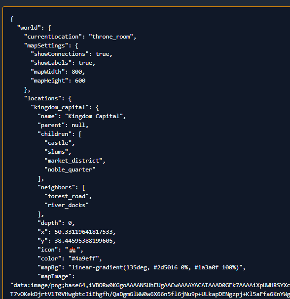 >>1470215 > Сейчас в таверне это все очень ненаглядно, а так можно привязывать точки интереса и нпс к месту на карте и прямо из этого интерфейса создавать и редактировать лорбучные записи. Если разделить все на зоны и трекать локацию, то активируется только то что рядом или входит в ту же зону. Звучит довольно объемно конечно, пока не знаю как это связывается. Ну вообще может и имеет смысл сделать расширение на карту, но надо сначала идею побреинштормить и нормально обозначить. Как вообще карта представлена должна быть, какой формат, где делаться должна? Вектор, не вектор?