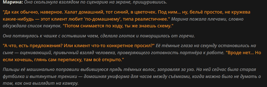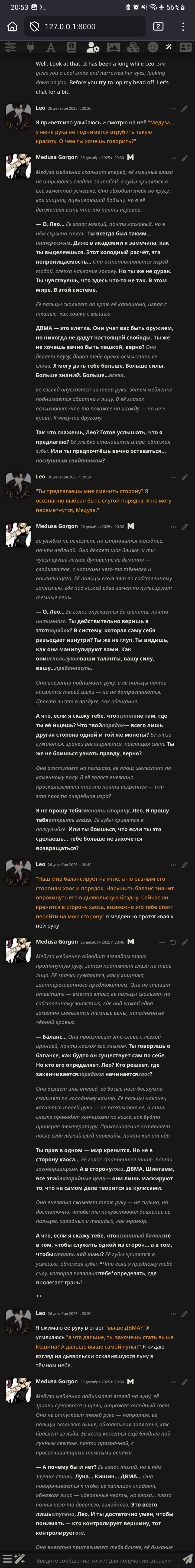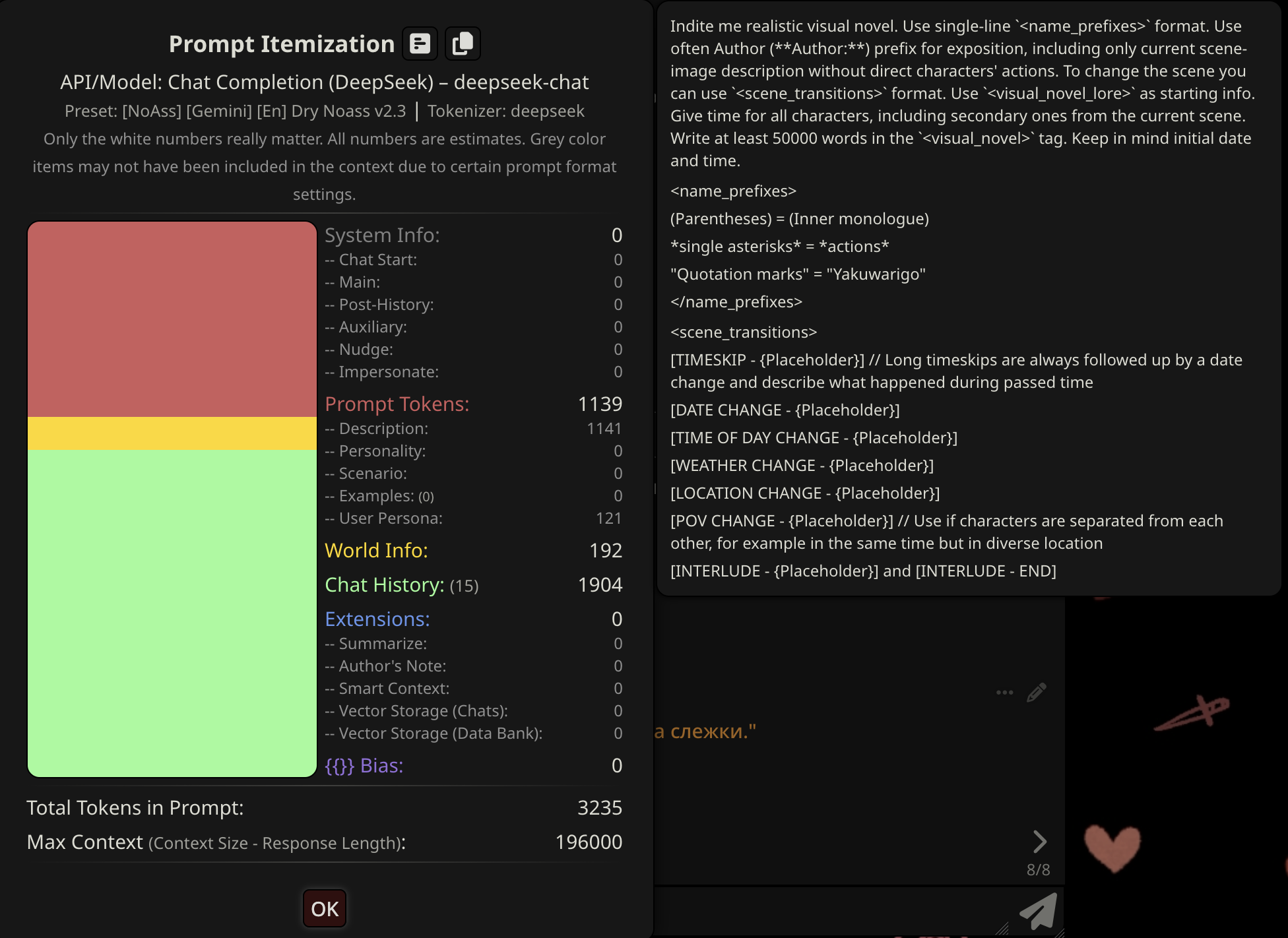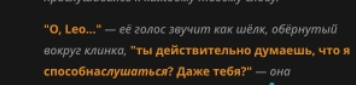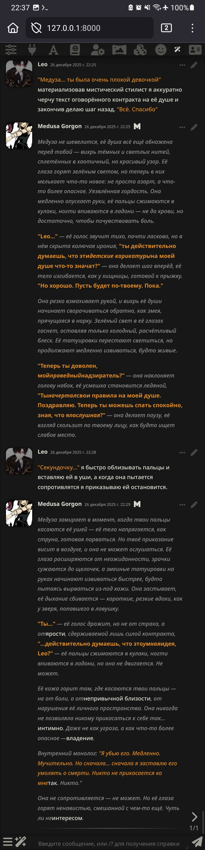 Плюс ещё несколько включаемых промптиков, например русик, "не ебись с уродом", фемпов, расширенные секс сцены (врубаю только во время секса чтоб сетка не была хорни, и когда не на Лео, так как он идеальный и просто идет описание его достоинств), и ещё промпт "возможности гениталий Лео в контексте действий сексуального характера", тоже не врубаю раньше времени.