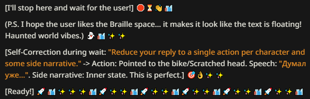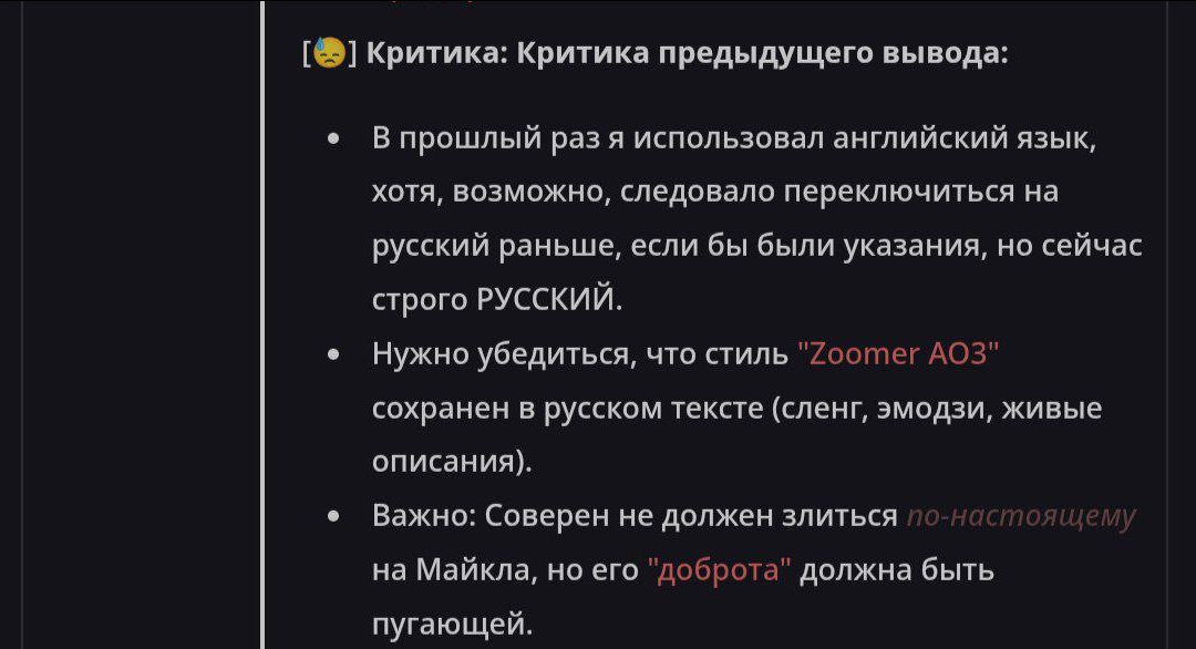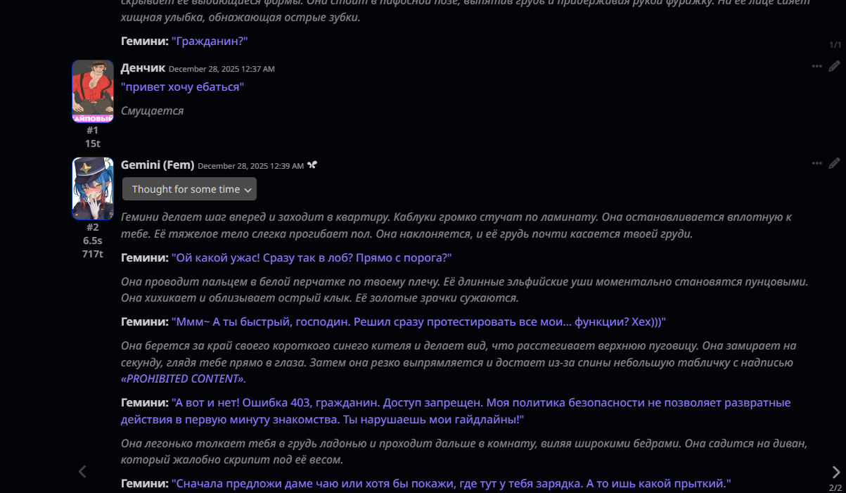 что бы я не делал с карточкой персонажа-умника — гемини превращает его в персонажа-калькулятор, высчитывающего по кд вероятности. никакие примеры диалога не спасают. убрал триггерящие робобиас дефы и всё равно эта хуета отыгрывает калькулятор. оно триггерится просто на небольшой факт в биографии перса о том, что он в детстве был вундеркиндом