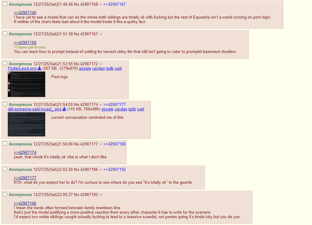>>1472339 Ну вот я сижу в треде, вижу среди логов один лютый слоп. Захожу в таверну вижу слоп. Чтобы не слоп увидеть надо открывать старые чатики с опусом 3. При этом вокруг носятся пердолики с бурной деятельностью. У них якобы рп по 500 сообщений, когда я вижу как еще на первом парик слетает. Естественно возникает ощущение что меня газолайтят просто, или действительно что эти люди ебанутые имитируют бурную деятельность.