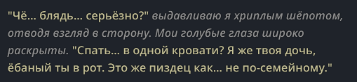 Пять гритингов, два просто для персонажа, три со связанными настолками. 1) {{user}} приходит домой к {{char}}, классика. 2) Спасение рядового косплеера Лены посреди ежегодного ЛудоКона, пока у нее не сдали нервы (и батарейки). 3) Играем в ДнД. Что 5е, что модули типа Фанделвера настолько прочно сидят в головах нейронок, что я даже правила не выписывал, и так сойдет. 4) Играем в Maid RPG. Очень рандомная и очень фансервисная хуйня, фишка которой (огромное количество рандомных таблиц и ивентов) плохо передается через нейронку, но как минимум хорни ролеплей на месте. 5) Играем в F.A.T.A.L. Величайший мем всея настолок, возможно худшая настольная игра эвер. Слово rape встречается в рулбуке 124 раза. Карту написал по большей части чтобы порофлить с отыгрыша этой залупы нейронкой, похуй что не канон, в каноне сам поди разберись сначала