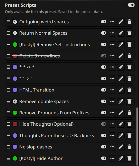 Поясните за Prompt Post-Processing в таверне, раньше же этой херни не было, и было нормально. А теперь, когда ставлю None, то сетка пишет как будто бы более кратко, но будто игнорирует какие-то инструкции выборочно и речь в какой-то момент начинает походить на ассистентскую, ставлю Single - начинает следовать всем инструкциям, ответ увеличивается в 2 раза, но форматирование проёбывается, плюс на некоторых сетках как будто двойные ответы (на манер нейросетей-генераторов изображений с двойным лицом), ставлю Strict - херня начинает писать за юзера, но будто бы следует инструкциям ещё строже. В доках об этом кратко слишком написанно, и непонятно, что считать за first message - это сам пресет, включая первое сообщение, или это только первое сообщение? Не знаю как у кого, но я привык строго начинать каждое рп в каждой карточки с сообщения от лица чара, а не от лица юзера.