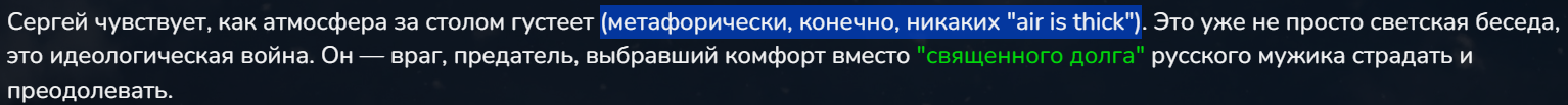 Короче все, нейроимпотенция полная. Когда начинал было очень много иллюзий, так сказать кредит доверия нейронкам, который они не выплатили. А в итоге воротит даже просто от вида нейропрозы.