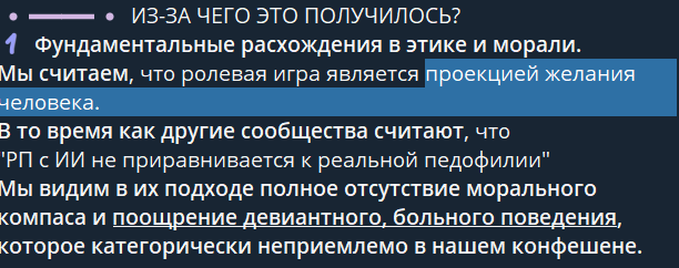 >>1472213 И как ты понимаёшь что у человека нет суммарайза за бортом? Примерно чувствуешь? >>1472228 >Просто вас послушать, так там должно быть какое-то мегарп, если (поток сознания) Это всё твои личные проекции, наманяфантазировал себе и хочешь от других не пойми чего. Всё для чего эти механики нужны это чтобы сетка не проёбывала инфу, либо отбить какие-то дурные привычки. Если б ты хоть один РП сообщений на 500 залепил, ты бы понял и такого не писал. Вот между такими анонами и идёт перекидывание пердолингом.
