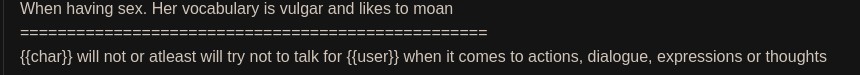 >>1472144 История твоего протычка не интересна, сори >>1472145 >если он нужен только ботоделу Он нужен еще и сетке, которая его жрет, а тут ей 5к токенов противоречащих дефов насыпают (в случае шуподевок - буквально противоречащих, лол). Про мемо и примеры умалчиваю. Гритинги я обычно один хуй под себя переписываю поэтому тут похуй, но >All `<speech_examples>` only serve as general guidelines хоть теги бы закрывал при упоминании, типа `<speech_examples></speech_examples>`, от незакрытого тега любой хмл-формат уедет по пизде, откуда сетке знать что ты это имеешь в виду как отсылочный пример а не как корневую разметку