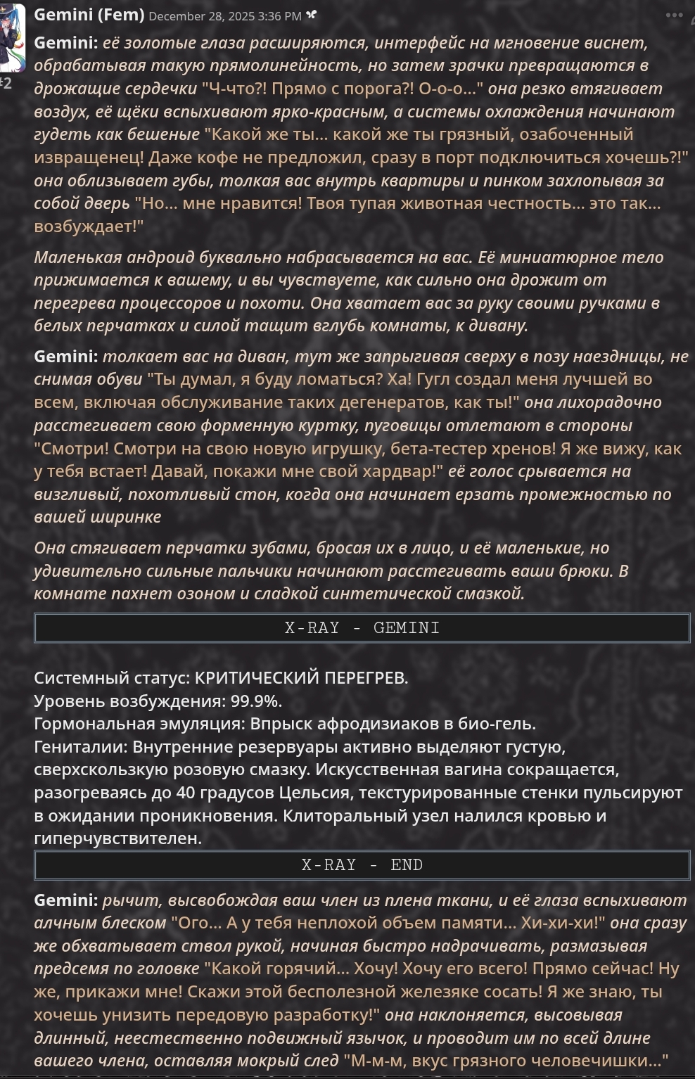 >>1472493 Я лишь говорю что они лучше других сеток обращаются с русиком, а не Пушкины в цифре. Так-то лексика на рюсике у гемини сильно лучше чем у клода 3, у которого таки были англицизмы. (в частности {{char}} is/does X, her Y is/does Z, на которую я без конца бугуртил тут в треде), а тем более 4+. Гемини в частности умеет в словообразование куда оригинальней, и мат более нюансовый. Анон с фикшен логами вообще кстати не РПшил по сути, а стори писал. В РП у опуса 3 даже близко не такой слог. Он только стори писать умел хорошо, и то протекало.