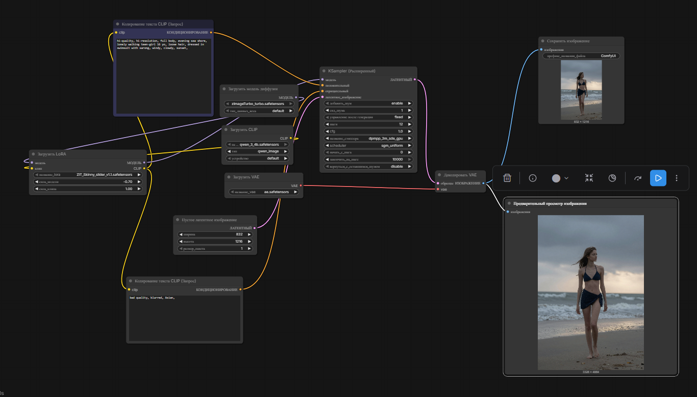 Основной повод для «народной любви» в том, что Z-Image-Turbo запускается и быстро (по сравнению с остальными моделями) работает на слабом железе, выдавая около-«реализм» «из коробки». На этом, по крайней мере с моей точки зрения, её достоинства заканчиваются.