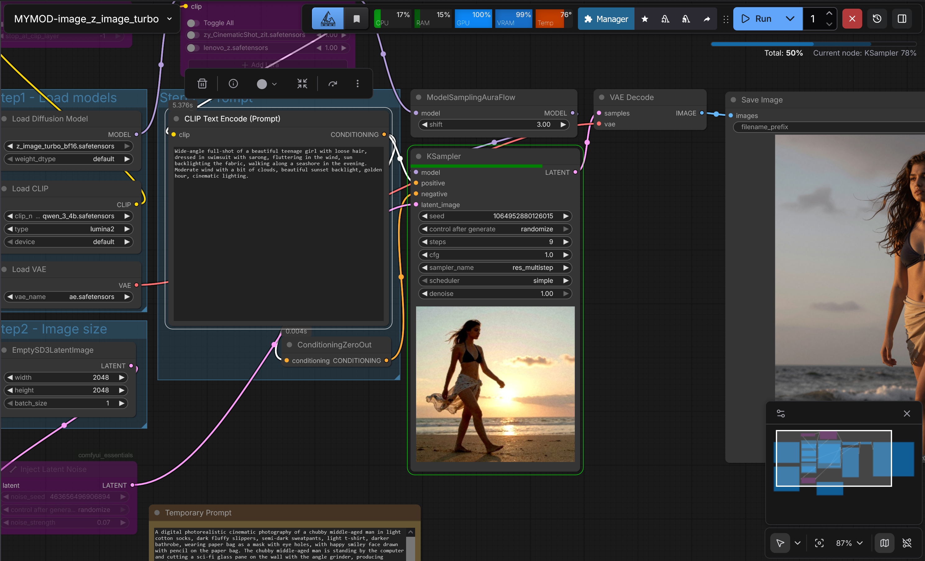 >>1478534 >Я не знаю, что я не так делаю, посмотрите сами... ZIT - модель, которая имеет свои особенности. Во первых - писать промпт ей надо детально. Во всех подробностях, натуральным языком. Официально знает китайский и английский, но русский тоже понимает, хоть и хуже. Во вторых - играть сэмплерами особо смысла нет - ей и стандартного euler/simple или euler/sgm_uniform хватает. Задирать количество шагов выше 9 - можно, но это влияет лишь на в некоторой степени, в основном - на четкость мелких деталей.