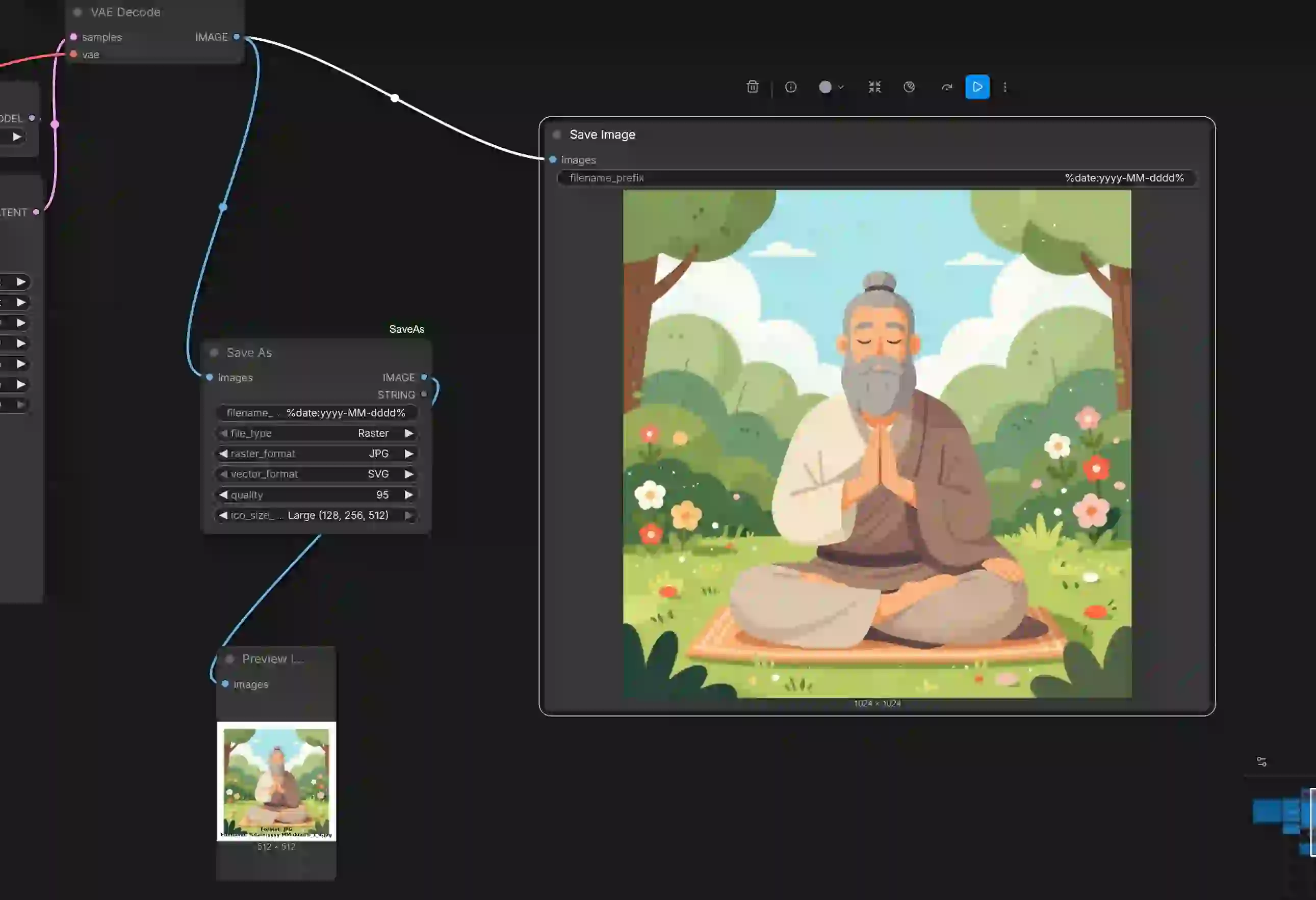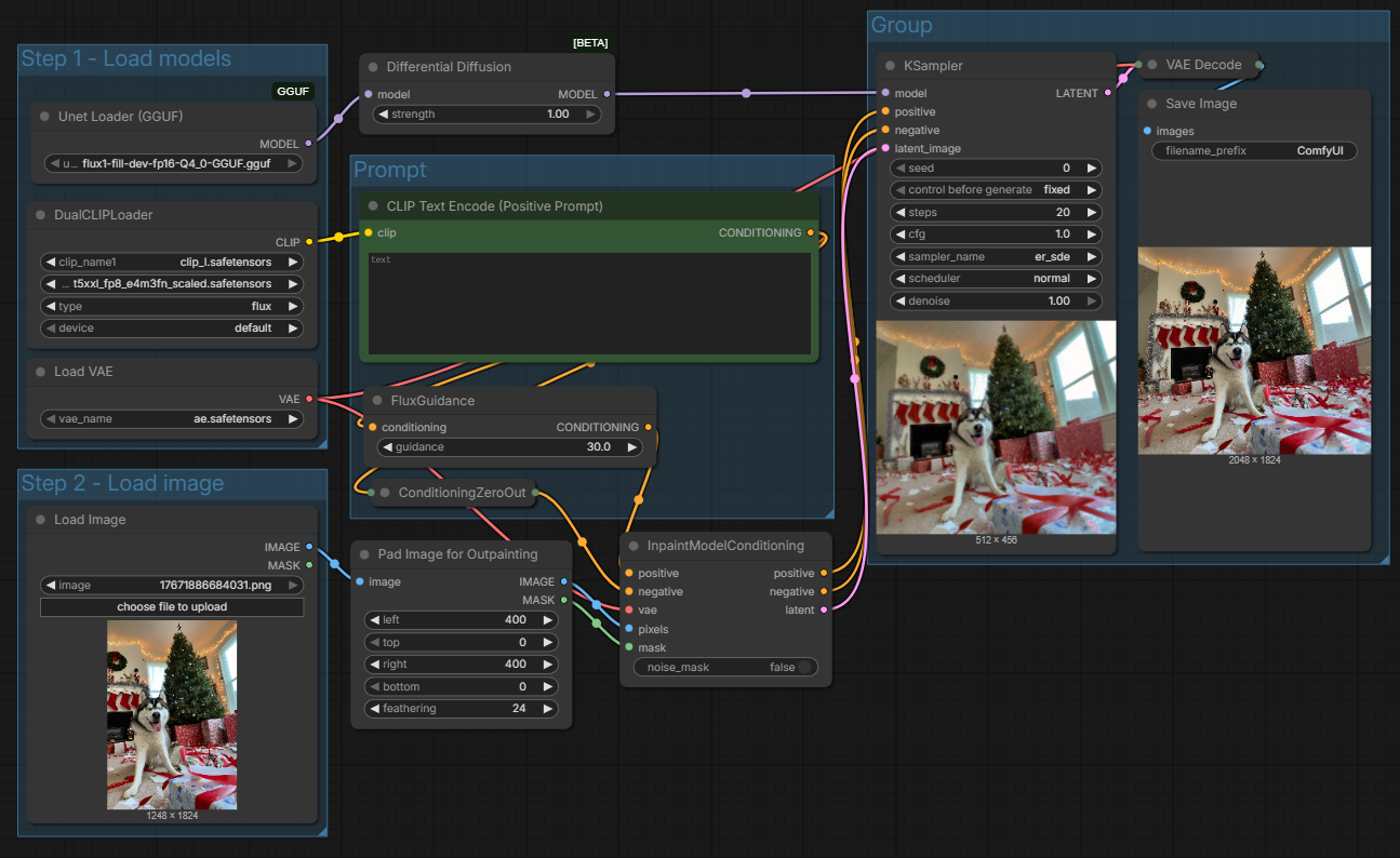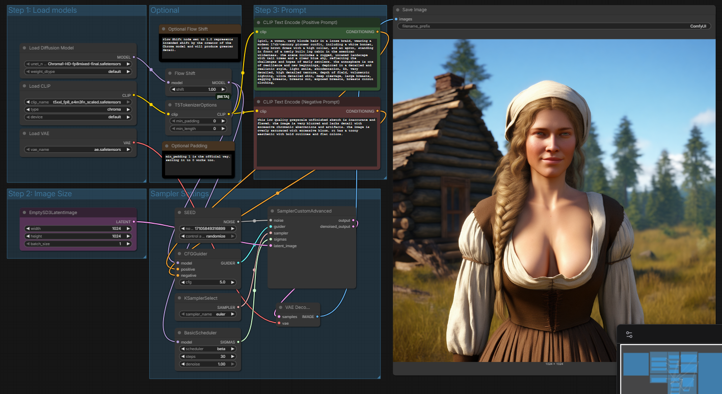>>1476274 >Реально не могу, потому что не понимаю логику построений под необходимый процесс Что именно тебе непонятно? Вот самый простой темплейт эвер для сдохли с прошлого треда, что тут неясно? Все пайплайны конструируются точно также - составные части модели с нодами для их загрузки, узлы с лорами, узлы промтинга, узел семплера, декодинг, могут добавляться специальные ноды для сборки видео если модель допустим для видео или на инпут картиночек ноды если i2i/i2v. Примитив же!