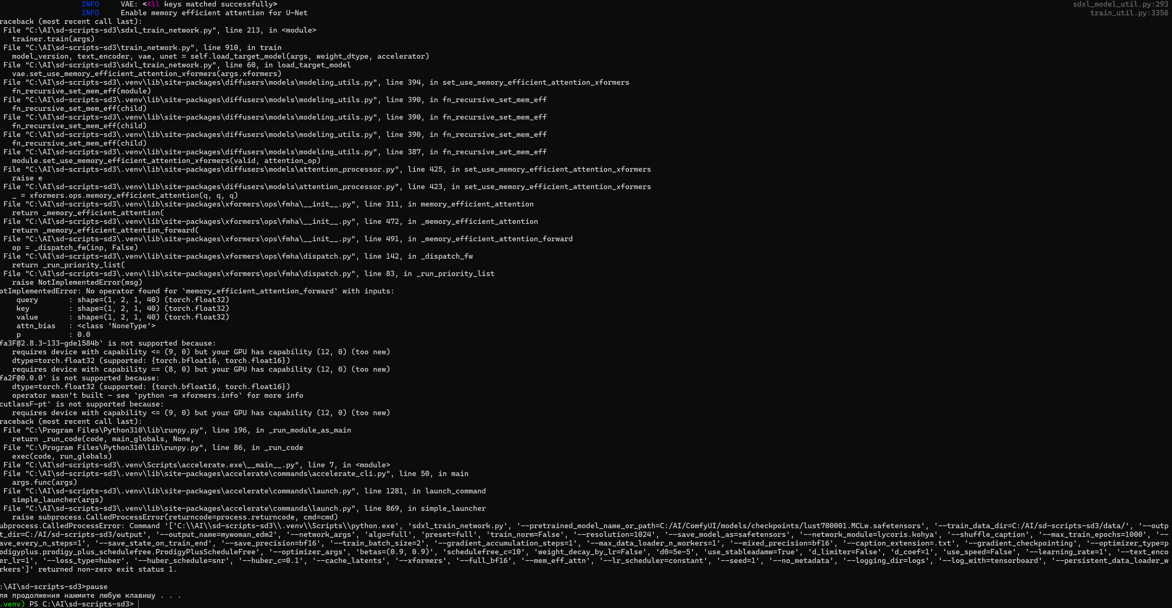 >>1483449 Вот так крашится (фотки схавал) Traceback (most recent call last): File "C:\AI\sd-scripts-sd3\sdxl_train_network.py", line 213, in <module> trainer.train(args) File "C:\AI\sd-scripts-sd3\train_network.py", line 910, in train model_version, text_encoder, vae, unet = self.load_target_model(args, weight_dtype, accelerator) File "C:\AI\sd-scripts-sd3\sdxl_train_network.py", line 60, in load_target_model vae.set_use_memory_efficient_attention_xformers(args.xformers) File "C:\AI\sd-scripts-sd3\.venv\lib\site-packages\diffusers\models\modeling_utils.py", line 394, in set_use_memory_efficient_attention_xformers fn_recursive_set_mem_eff(module) File "C:\AI\sd-scripts-sd3\.venv\lib\site-packages\diffusers\models\modeling_utils.py", line 390, in fn_recursive_set_mem_eff fn_recursive_set_mem_eff(child) File "C:\AI\sd-scripts-sd3\.venv\lib\site-packages\diffusers\models\modeling_utils.py", line 390, in fn_recursive_set_mem_eff fn_recursive_set_mem_eff(child) File "C:\AI\sd-scripts-sd3\.venv\lib\site-packages\diffusers\models\modeling_utils.py", line 390, in fn_recursive_set_mem_eff fn_recursive_set_mem_eff(child) File "C:\AI\sd-scripts-sd3\.venv\lib\site-packages\diffusers\models\modeling_utils.py", line 387, in fn_recursive_set_mem_eff module.set_use_memory_efficient_attention_xformers(valid, attention_op) File "C:\AI\sd-scripts-sd3\.venv\lib\site-packages\diffusers\models\attention_processor.py", line 425, in set_use_memory_efficient_attention_xformers raise e File "C:\AI\sd-scripts-sd3\.venv\lib\site-packages\diffusers\models\attention_processor.py", line 423, in set_use_memory_efficient_attention_xformers _ = xformers.ops.memory_efficient_attention(q, q, q) File "C:\AI\sd-scripts-sd3\.venv\lib\site-packages\xformers\ops\fmha\__init__.py", line 311, in memory_efficient_attention return _memory_efficient_attention( File "C:\AI\sd-scripts-sd3\.venv\lib\site-packages\xformers\ops\fmha\__init__.py", line 472, in _memory_efficient_attention return _memory_efficient_attention_forward( File "C:\AI\sd-scripts-sd3\.venv\lib\site-packages\xformers\ops\fmha\__init__.py", line 491, in _memory_efficient_attention_forward op = _dispatch_fw(inp, False) File "C:\AI\sd-scripts-sd3\.venv\lib\site-packages\xformers\ops\fmha\dispatch.py", line 142, in _dispatch_fw return _run_priority_list( File "C:\AI\sd-scripts-sd3\.venv\lib\site-packages\xformers\ops\fmha\dispatch.py", line 83, in _run_priority_list raise NotImplementedError(msg) NotImplementedError: No operator found for `memory_efficient_attention_forward` with inputs: query : shape=(1, 2, 1, 40) (torch.float32) key : shape=(1, 2, 1, 40) (torch.float32) value : shape=(1, 2, 1, 40) (torch.float32) attn_bias : <class 'NoneType'> p : 0.0 `[email protected]` is not supported because: requires device with capability <= (9, 0) but your GPU has capability (12, 0) (too new) dtype=torch.float32 (supported: {torch.bfloat16, torch.float16}) requires device with capability == (8, 0) but your GPU has capability (12, 0) (too new) `[email protected]` is not supported because: dtype=torch.float32 (supported: {torch.bfloat16, torch.float16}) operator wasn't built - see `python -m xformers.info` for more info `cutlassF-pt` is not supported because: requires device with capability <= (9, 0) but your GPU has capability (12, 0) (too new) Traceback (most recent call last): File "C:\Program Files\Python310\lib\runpy.py", line 196, in _run_module_as_main return _run_code(code, main_globals, None, File "C:\Program Files\Python310\lib\runpy.py", line 86, in _run_code exec(code, run_globals) File "C:\AI\sd-scripts-sd3\.venv\Scripts\accelerate.exe\__main__.py", line 7, in <module> File "C:\AI\sd-scripts-sd3\.venv\lib\site-packages\accelerate\commands\accelerate_cli.py", line 50, in main args.func(args) File "C:\AI\sd-scripts-sd3\.venv\lib\site-packages\accelerate\commands\launch.py", line 1281, in launch_command simple_launcher(args) File "C:\AI\sd-scripts-sd3\.venv\lib\site-packages\accelerate\commands\launch.py", line 869, in simple_launcher raise subprocess.CalledProcessError(returncode=process.returncode, cmd=cmd) > у тя не портабл чтоли? Да вроде нет, ну в браузере запускаю через павершел python main.py