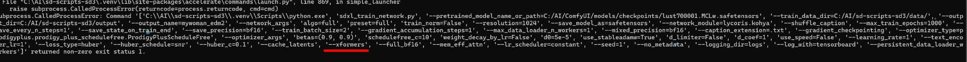 sdxl_train_network.py: error: unrecognized arguments: --network_model_as=safetensors constant --edm2_loss_weighting_num_generate_graph_limit=150 --edm2_loss_reduced_use_float64 Traceback (most recent call last): File "C:\Program Files\Python310\lib\runpy.py", line 196, in _run_module_as_main return _run_code(code, main_globals, None, File "C:\Program Files\Python310\lib\runpy.py", line 86, in _run_code exec(code, run_globals) File "C:\AI\sd-scripts-sd3\.venv\Scripts\accelerate.exe\__main__.py", line 7, in <module> File "C:\AI\sd-scripts-sd3\.venv\lib\site-packages\accelerate\commands\accelerate_cli.py", line 50, in main args.func(args) File "C:\AI\sd-scripts-sd3\.venv\lib\site-packages\accelerate\commands\launch.py", line 1281, in launch_command simple_launcher(args) File "C:\AI\sd-scripts-sd3\.venv\lib\site-packages\accelerate\commands\launch.py", line 869, in simple_launcher raise subprocess.CalledProcessError(returncode=process.returncode, cmd=cmd)