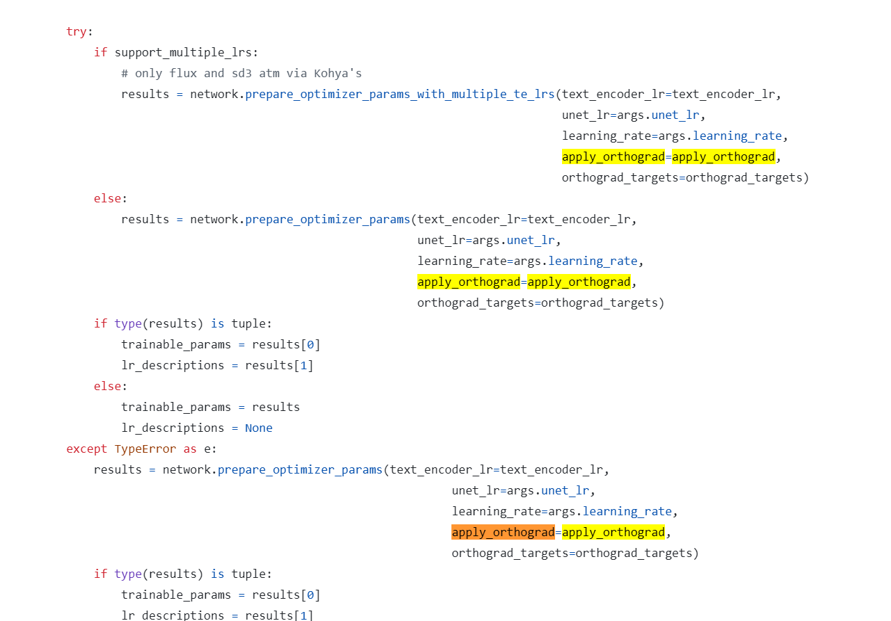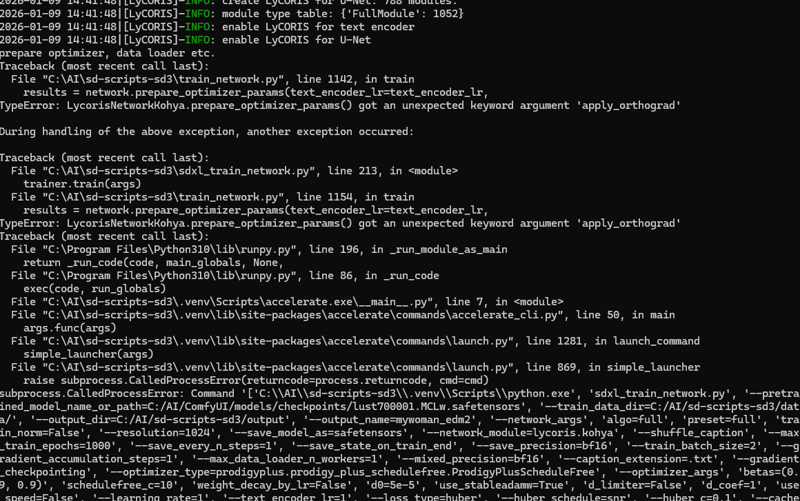 >>1483920 TypeError: LycorisNetworkKohya.prepare_optimizer_params() got an unexpected keyword argument 'apply_orthograd' Это главная причина — метод prepare_optimizer_params в твоей версии LyCORIS не принимает параметр apply_orthograd (он есть только в более новых версиях LyCORIS или в форке, который ожидает этот флаг). Ты используешь --network_module="lycoris.kohya" с параметрами, которые предназначены для новой версии LyCORIS (где добавлен orthograd для оптимизации), но в твоём venv стоит lycoris-lora 3.4.0 — в этой версии метод не принимает apply_orthograd.