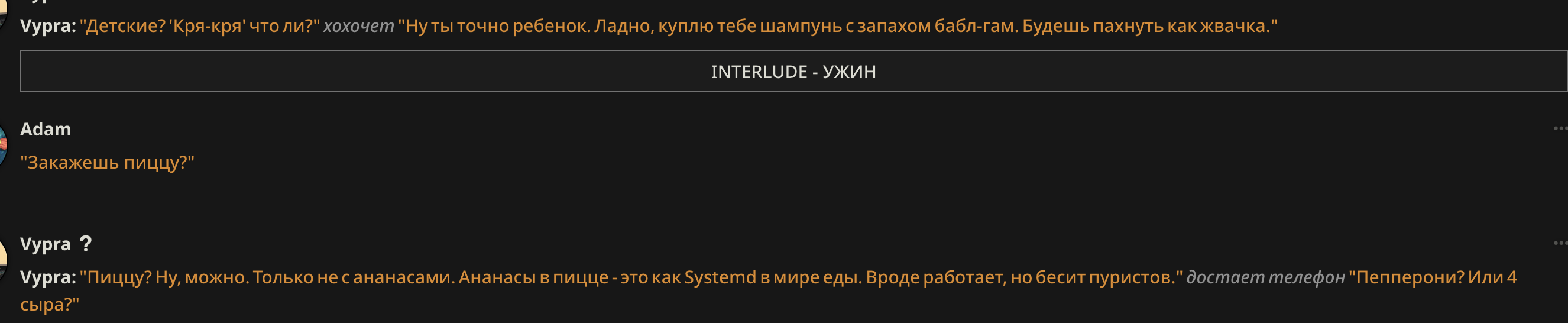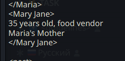 >>1481887 Формат префиксов да, но там у меня они добавляются мейн чару регресом. А в оутпуте их нет, так как я его в префилле держу. То есть если шиза стукает, то на таких РП 1 на 1 мне очень легко менять формат префиксов