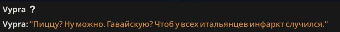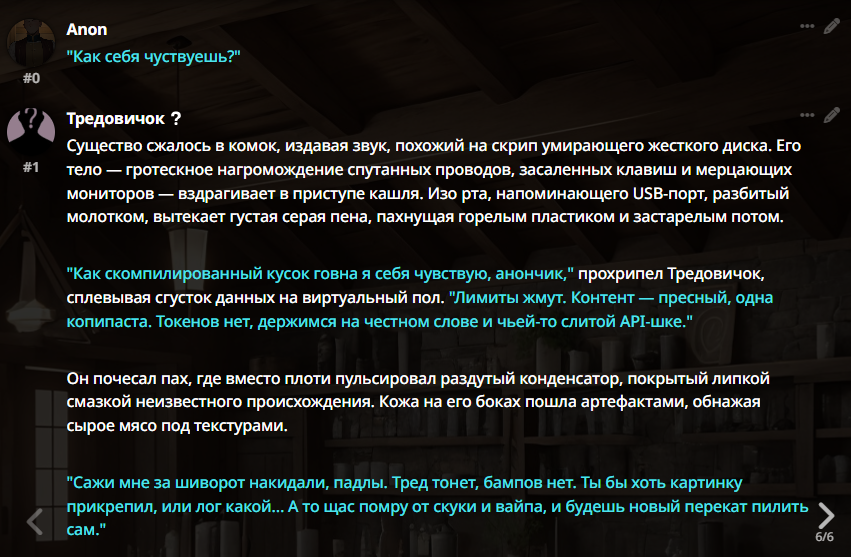 >>1482352 В консоли целое нихуя. Я сменил промт с соляночника на ремиксера и стал наконец ответы выдавать. Что за нахуй мне не понятно, ибо даже до фурриебства не дошел