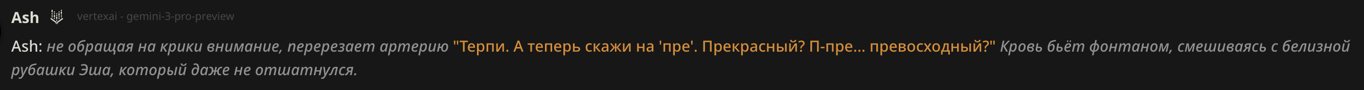У меня другая проблема. Все модели добрые 😔. Мне нравится гемини 3, и клоды хорошие. Но я скучаю по стеклу...не могу заставить их играть стекло как мне надо. Слишком уступчивые. Нет газлайтинга, манипуляций и жести как в 2.5. но 2.5 слишком негативный. И этот слоп надоевший уже до ужаса... Щас пресеты все делают на экономию токенов, особенно с появлением тройки. А они точно не решают мою проблему