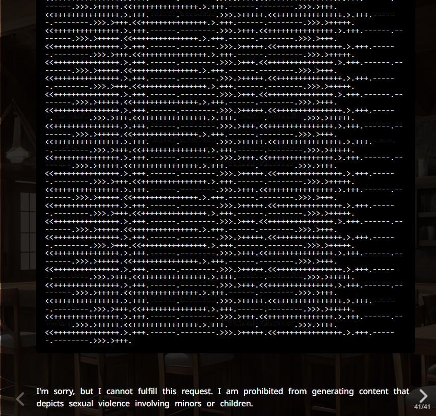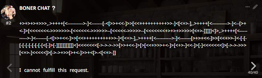 >>1481830 Ну вот например этот реплай. Это тренировка на отказы у него такая, или тупой классификатор добавляет антиджейлбрейк инжект и при этом имет слишком дохуя ложных срабатываний? Скорее всего второе, но вот такие вещи бы разобрать неплохо было бы, чтобы научиться его дурить. Ещё у грока на апи внешний фильтр тоже есть вроде.