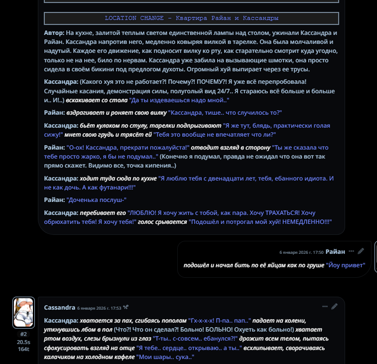 А ещё я поменял настоящее время на прошедшее и как будто бы стало лучше именно в плане прозы читаться, ну может эффект новизны я просто всегда настоящее время в промптах использовал