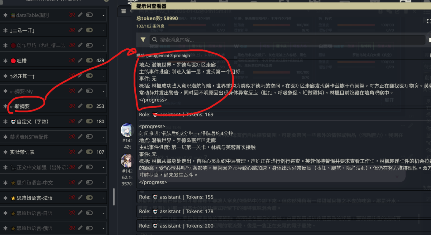 >>1480482 >Как заставить сетку делать законченные сообщения, а не обрезать их на полуслове? Если это гемини, читать полезности в шапке и обходить фильтр. Если на всех так, то оно на 800т и обрезает, больше некому так делать кроме таверны и фильтра. >Какой промт прописать, что-бы если в карточке несколько персов, промт не подтягивал силком остальных персов, если они напрямую не участвуют в сцене? Такая проблемка конкретно на гемини у меня возникает, а на клодах нет. Такая проблема есть везде, просто у клода работа с контекстом хуже, лол. Решение простое - не иметь этих персов в контексте, пока они не нужны. В таверне для этого применяется лорбук. Если нужно чтобы сетка знала об их существовании, но не подтягивала, придётся делать однострочники и промптить костылями, в частности ризонингом.