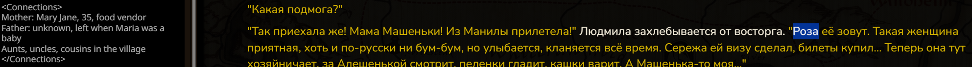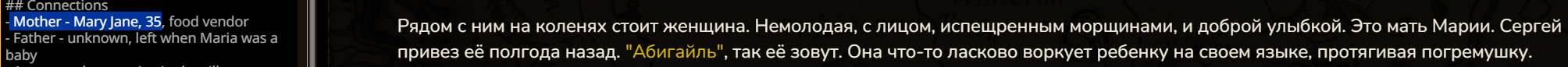>>1481963 Ну на мой вкус лорбука мало. У меня есть чар - я ввел в рп ее мамку, подругу как вполне себе персонажей. сетка на лету придумывает их бек - и вот его бы собирать в карточку, чтобы они могли что-то делать и без юзера, на фоне
