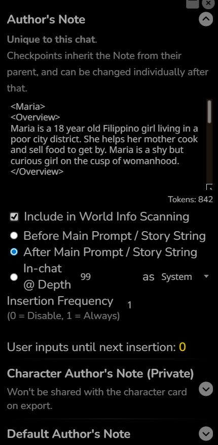 >>1482103 Creator notes = тупо описание карточки, никуда не идёт. Character notes = поле в карточке. Можно юзать чтобы засунуть на глубину что-либо. Пресетом не отключается. Author's note = поле в чате, и хранится вместе с ним. Переключишься на другой чат - оно будет другим. Туда можно например суммарайз засунуть.